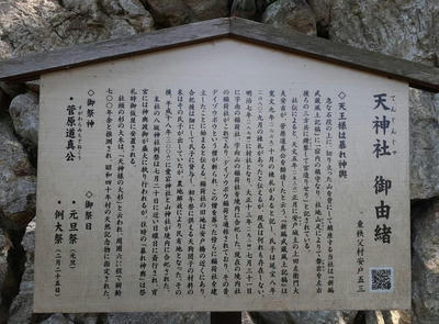 社号標柱のすぐ奥にある庚申塔・弁才天 石段の脇左側に設置された手書きの御由緒書