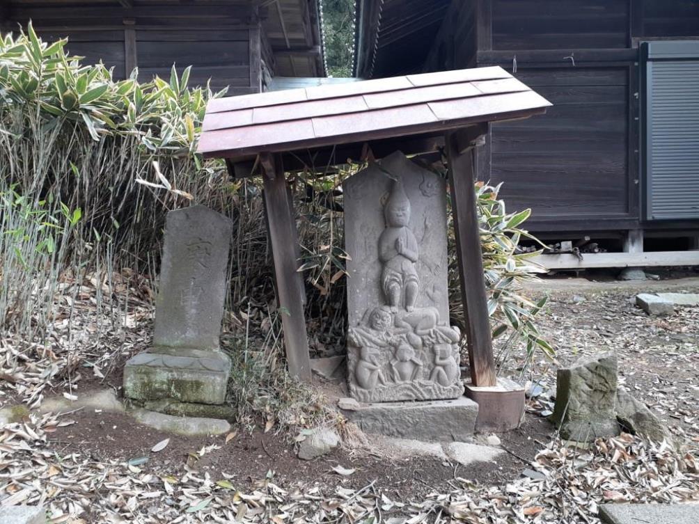 石碑群は左から三猿庚申塔、冨士浅間大神、不動明王・金毘羅大権現・愛染明王、冨士浅間大神。並びの後ろのある石像もあるが名称は不明。
