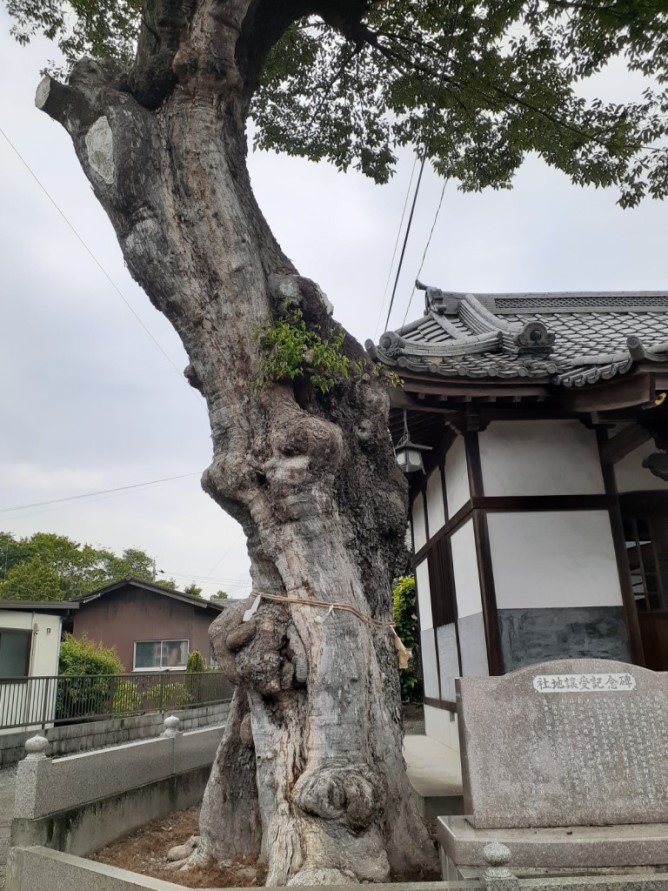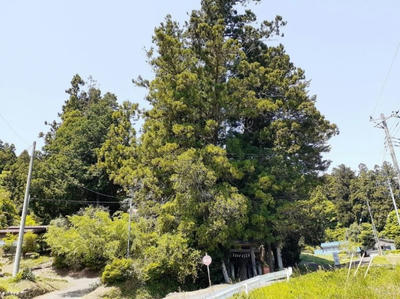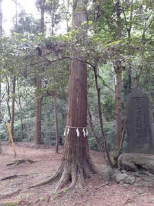 鳥居のすぐ先には紙垂が巻かれている杉の御神木がある。