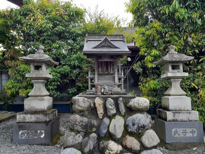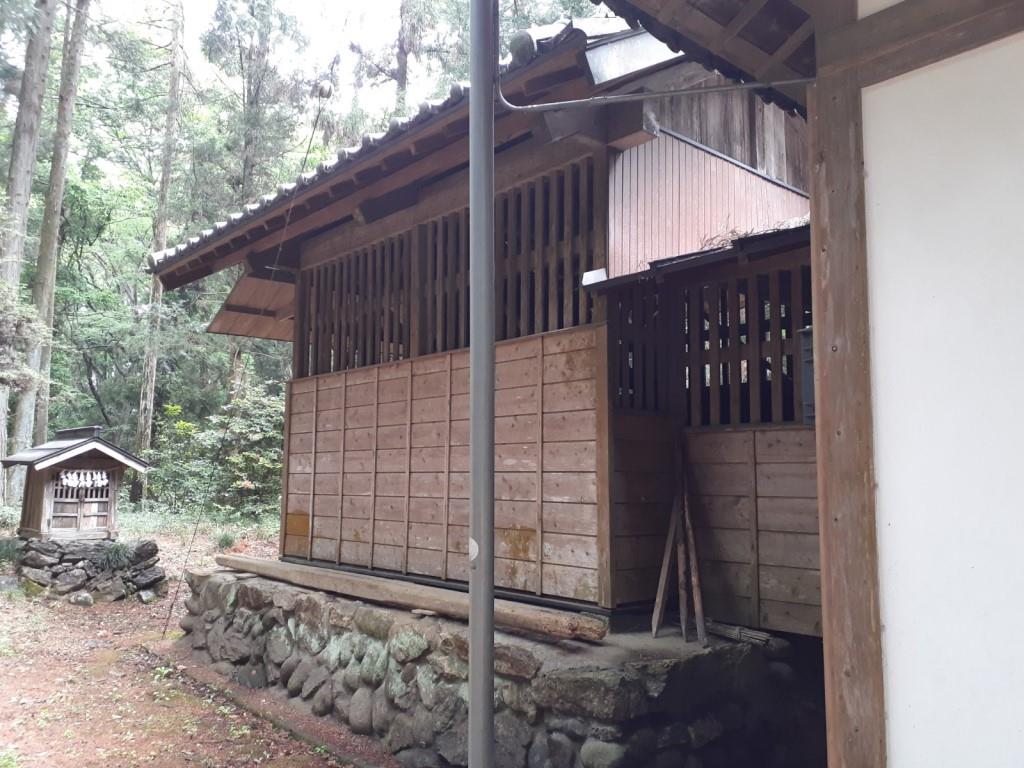 社殿の左側に鎮座する境内社・天神社 社殿の左側奥に祀られている神興庫と八坂神社