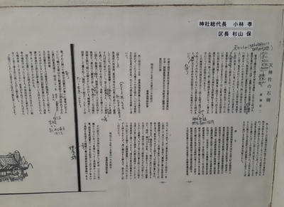 この無格社の天神社氏子は三~四十名程で鄙びた社であった。その社にそぐわない立派な鳥居と石碑があり、幟が元日を含め年四回程立てられ祭典が行われていた。