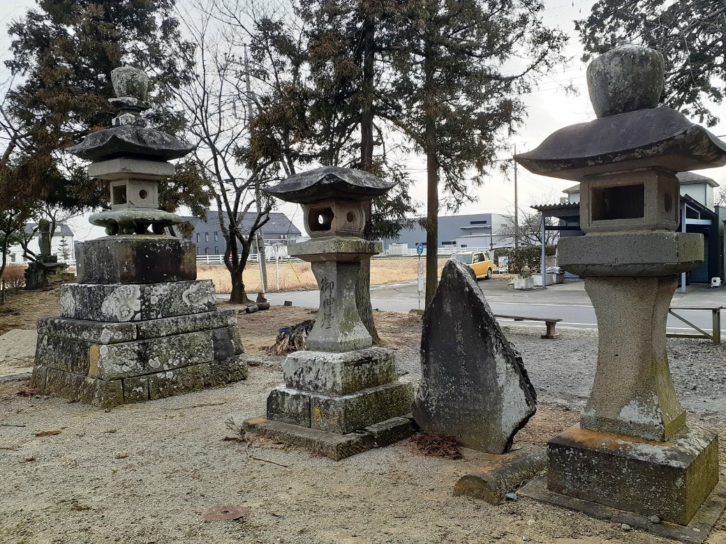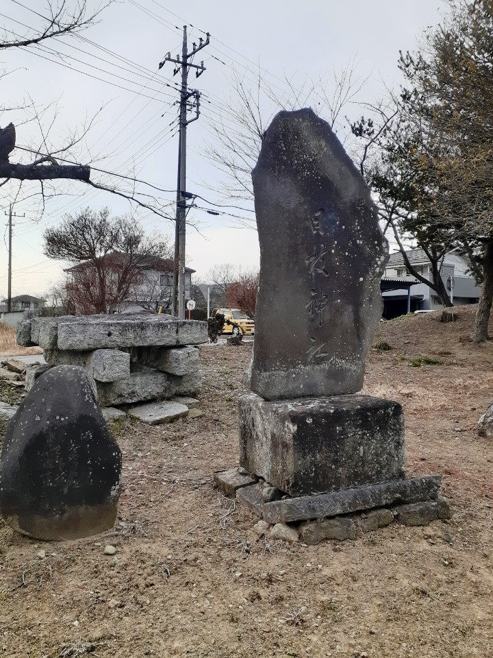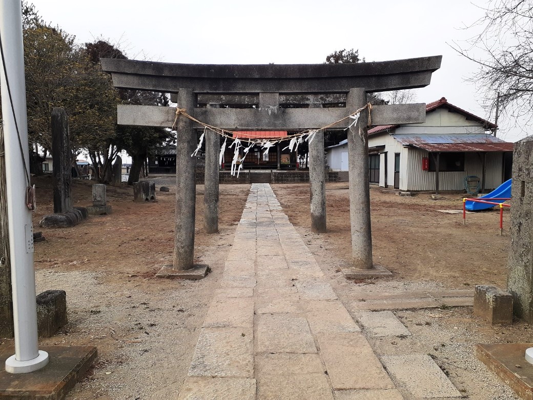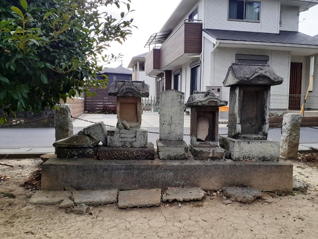境内には石塔が並び、写真右手前のものには「水屋幟竿置場」と明記されている。「水屋」とは屋敷内において日常生活空間の母屋より高く盛られた盛土及び,その上に建てられる上屋のことをいう。江戸時代の水屋は利根川水系の周辺で数多くつくられたらしい。