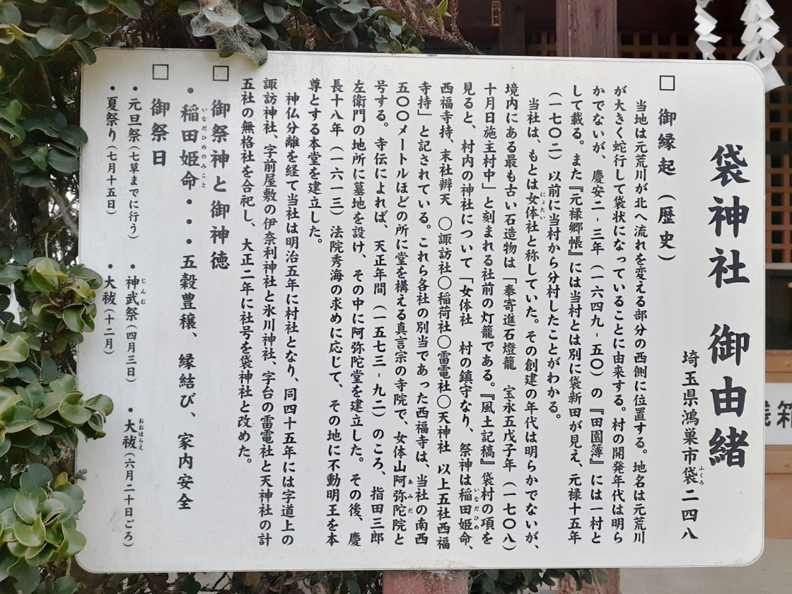 鴻巣市袋地域に鎮座する袋神社は嘗て「女体社」と称していた。奇しくも埼玉県さいたま市緑区にある「氷川女體神社」と同じ名称であり、ご祭神も共に稲田姫命(櫛名田比売の別名)が祀られている。