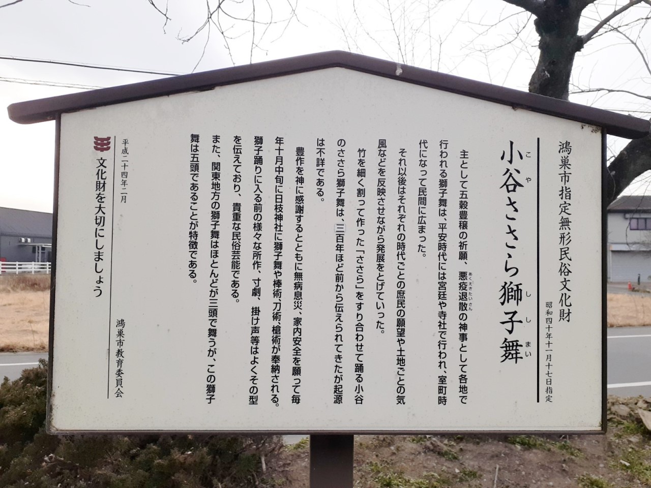 また、関東地方の獅子舞はほとんどが三頭で舞うが、この獅子舞は五頭であることが特徴である。      平成二十四年二月 鴻巣市教育委員会