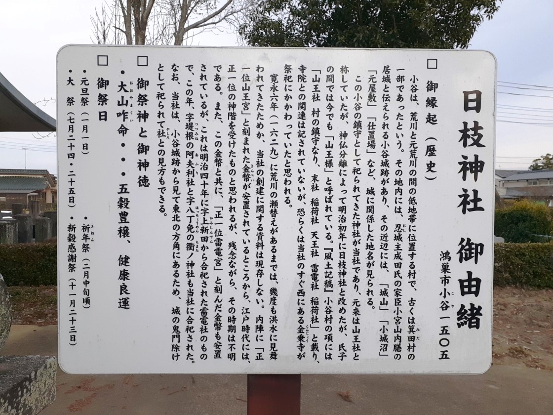 この小谷の鎮守として祀られてきた神社が当社であり、元来は山王社と称していたが、神仏分離によって明治初年に日枝神社と改めたが、氏子の間では今でも「山王様」と呼ばれている。『風土記稿』小谷村の項には「山王社 村の鎮守なり、稲荷社 天王社 雷電社 稲荷社」と載り、寺院との関連は記されていないが、恐らくは当社のすぐ西にある金乗寺が祭祀にかかわっていたと思われる。
