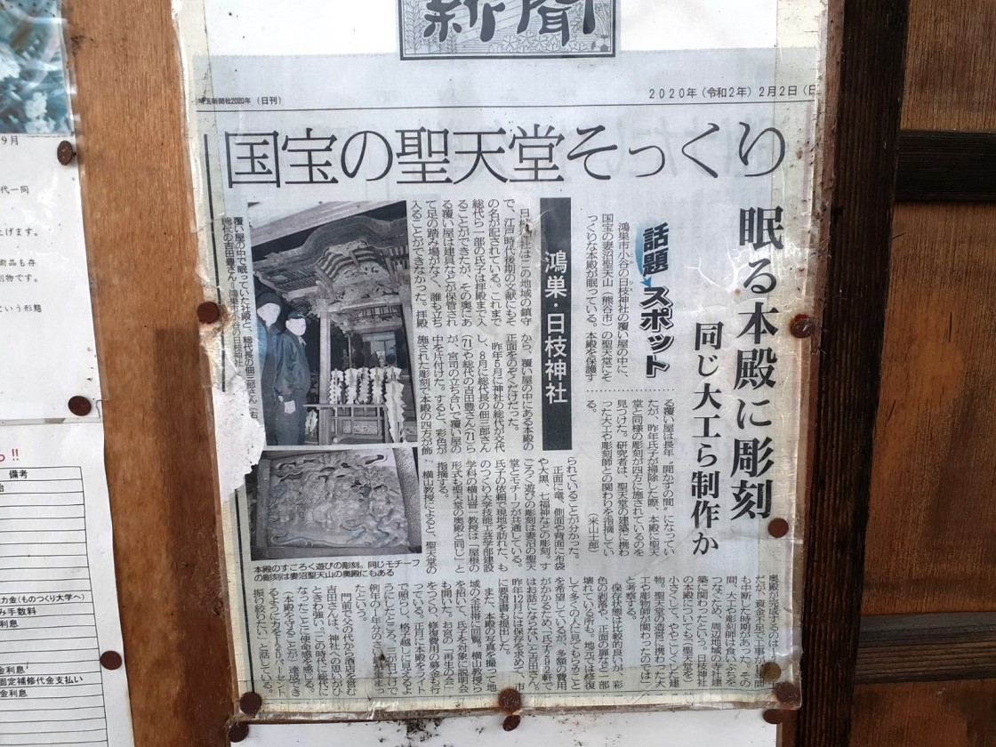 鴻巣市小谷(こや)の日枝(ひえ)神社の覆い屋の中に、国宝の妻沼聖天山(熊谷市)の聖天堂にそっくりな本殿が眠っている。本殿を保護する覆い屋は長年"開かずの間"になっていたが、昨年氏子が掃除した際、本殿に聖天堂と同様の彫刻が四方に施されているのを見つけた。研究者は、聖天堂の建築に携わった大工や彫刻師との関わりを指摘している。