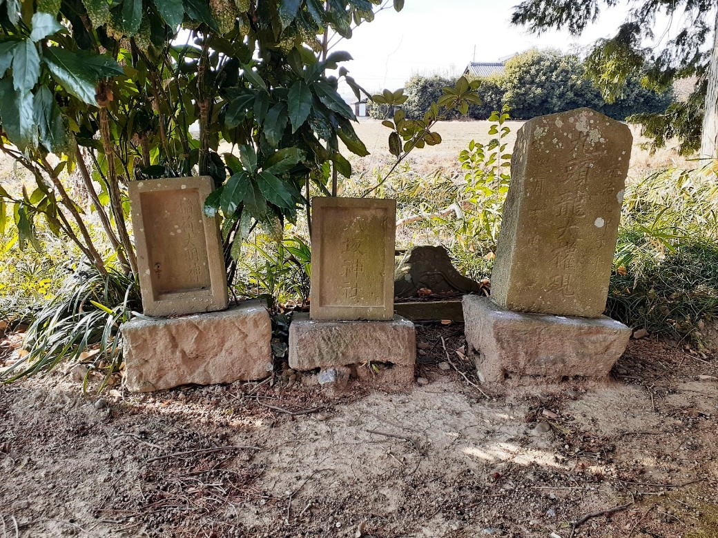 拝殿の両側には幾多の石碑が並べて置かれており、右側(写真左)には「塞神」の祠が3基あり(右から2番目は詳細不明)、左側(同右)には、左より「〇〇大明神 稲荷大明神・八坂神社・九頭龍大権現」と記された祠が3基並んで置いてある。