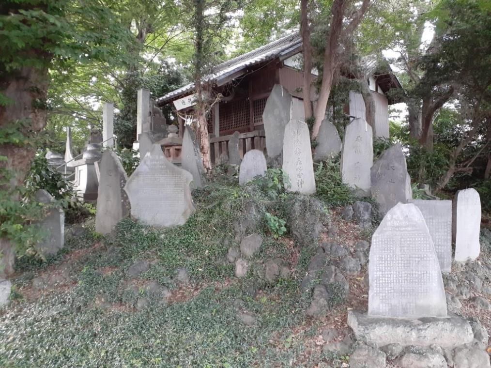 社殿左側には多くの石祠、石碑、そして奥には不動明王像が無造作に並ぶ。