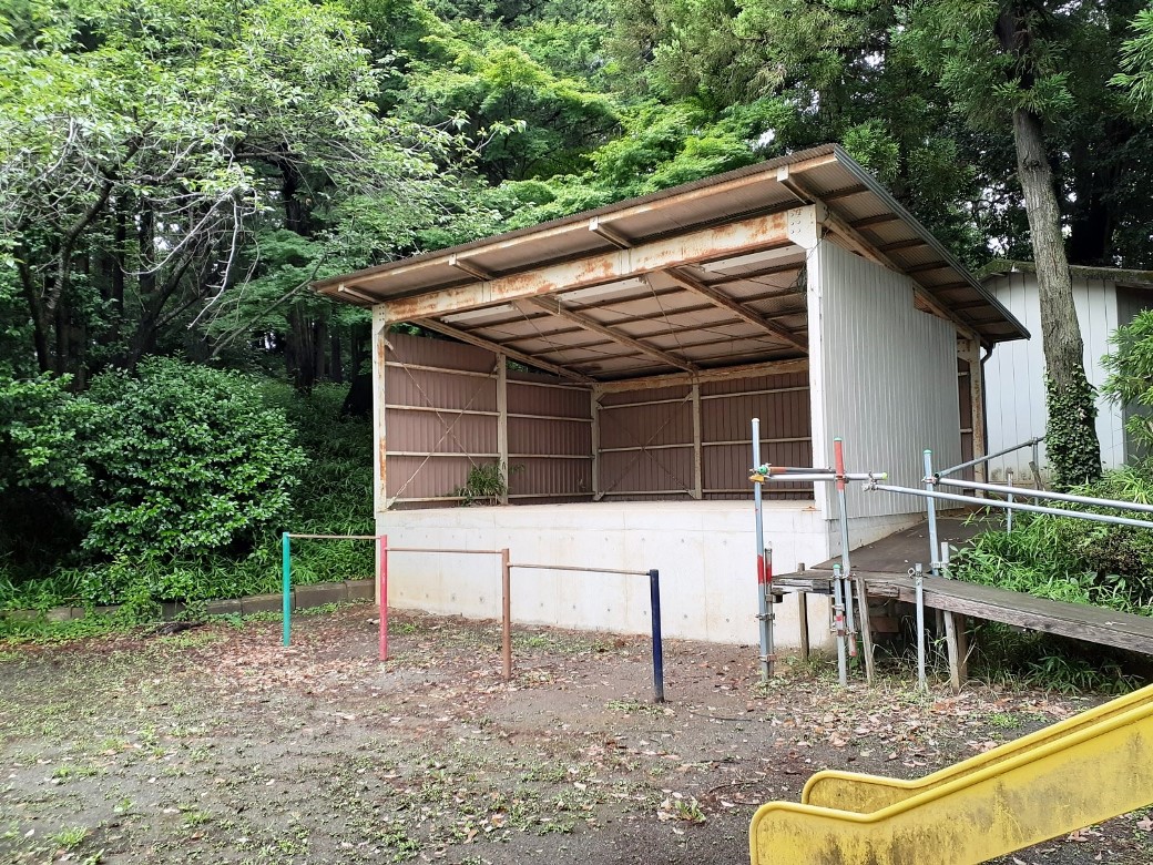 社に隣接している「子供広場」に設置されている祭り用の舞台だろうか。