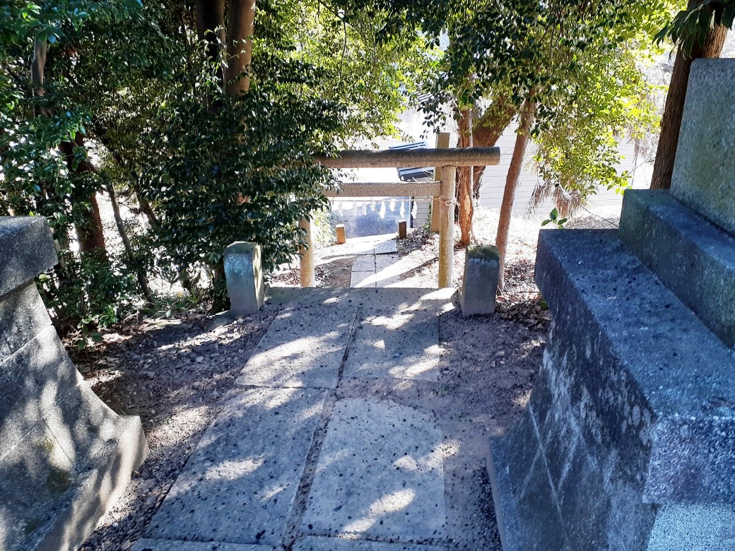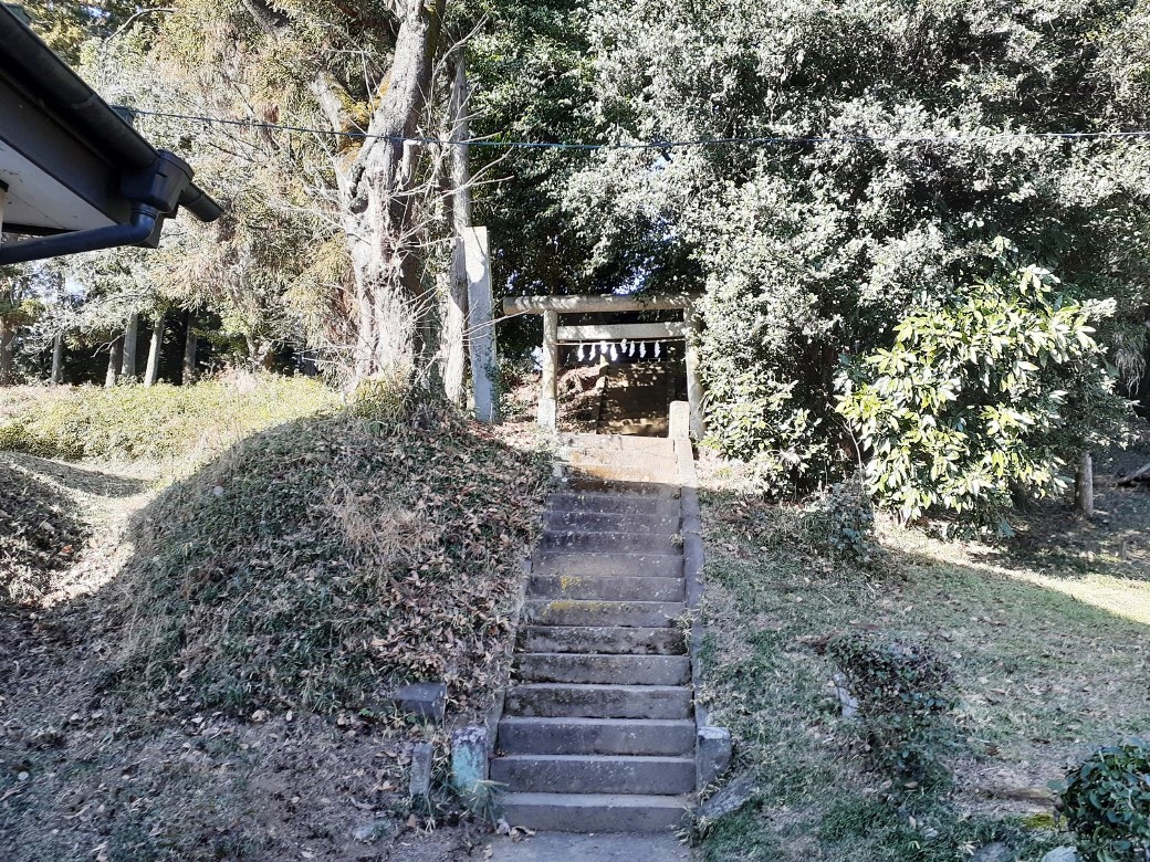 一の鳥居を過ぎて、石段、二の鳥居が見える。 二の鳥居の先には境内が広がる。