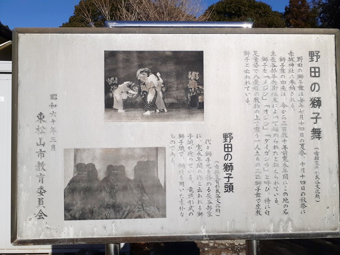 野田の獅子舞は毎年七月十四日の夏祭、十月十四日の秋祭に赤城神社に奉納される。