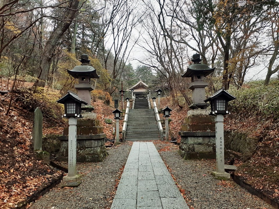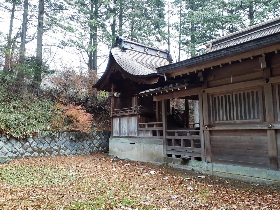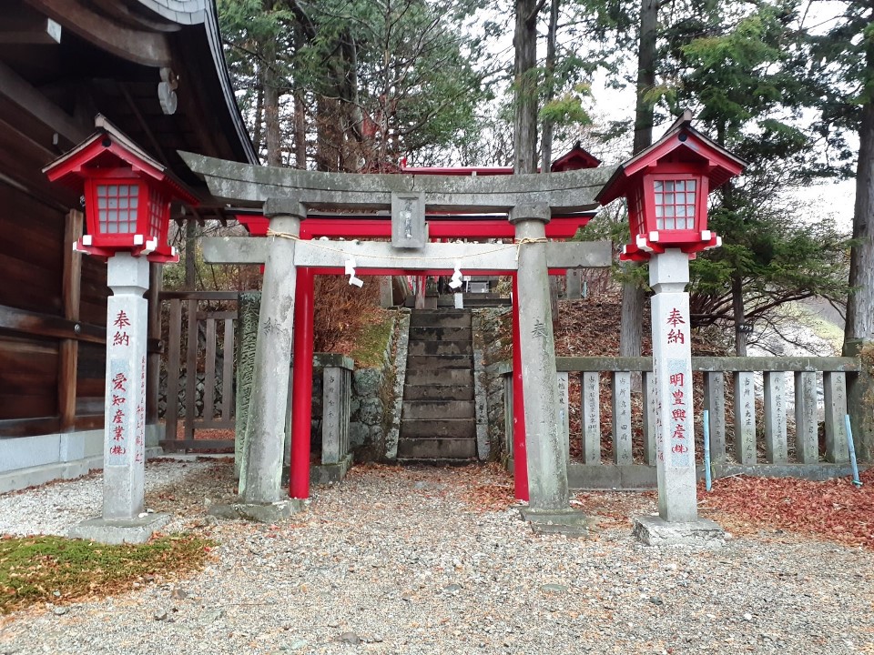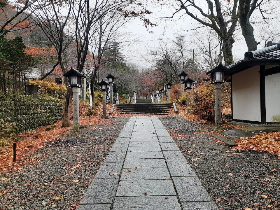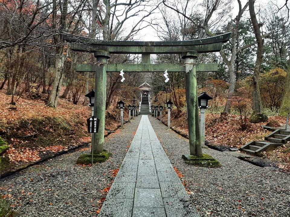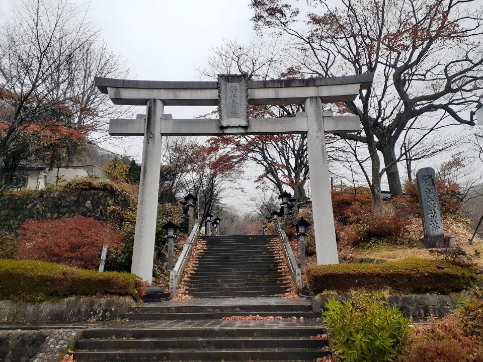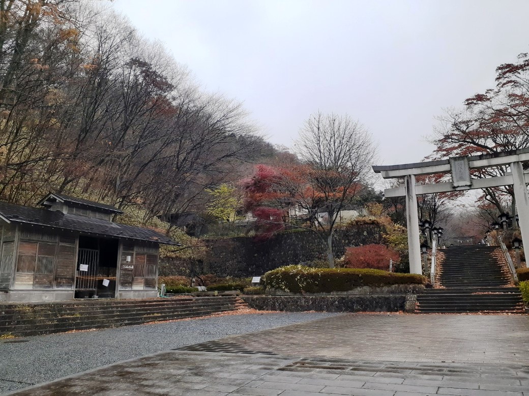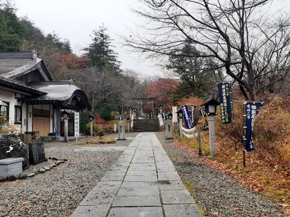 駐車スペースは鳥居の南側、「那須町観光協会」建物の向かいに十数台駐車できる場所が確保されていて(しかも無料)、そこの一角に停めてから参拝を行う。車を降りた瞬間から、「プーン」と硫黄の香りが漂う周辺環境は、温泉地そのもの。また紅葉は丁度見頃で雰囲気がとても良く、雨交じりの天候ながら、さわやかな朝の空気を体内に入れながら気持ち良く参拝できた。