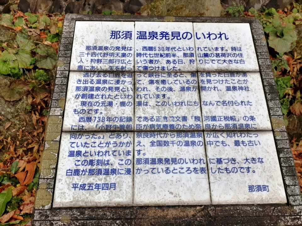 那須温泉の発見は、西暦630年代といわれています。時は三十四代舒明天皇の時代七世紀前半、那須山麓の茗荷沢の住人・狩野三郎行広という者が、ある日、狩りにでて大きな白鹿にあい、矢を射って傷つけました。