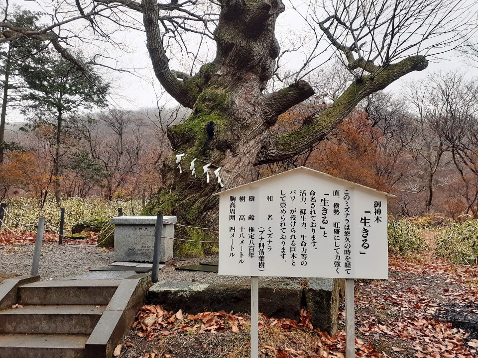 三の鳥居を過ぎてから参道の右側には推定樹齢800年・樹高18m・周囲4mのご神木がある。ご神木名「生きる」。ご神木の手前にある案内板を確認するとミズナラ(水楢)の大木で、しめ縄が付けられている。杉や楠や銀杏の巨木でご神木となっているものが主流の中で、ミズナラのご神木は初めて見る。