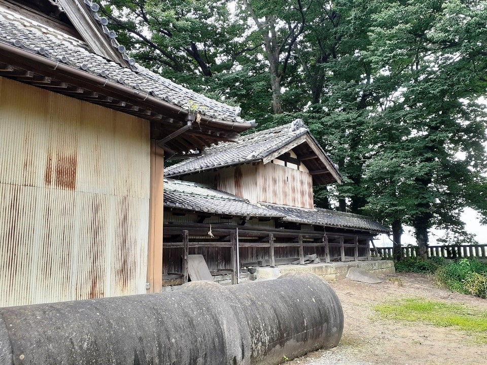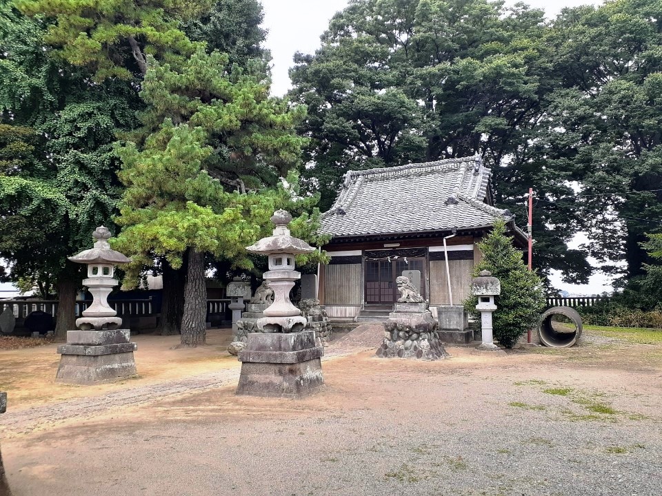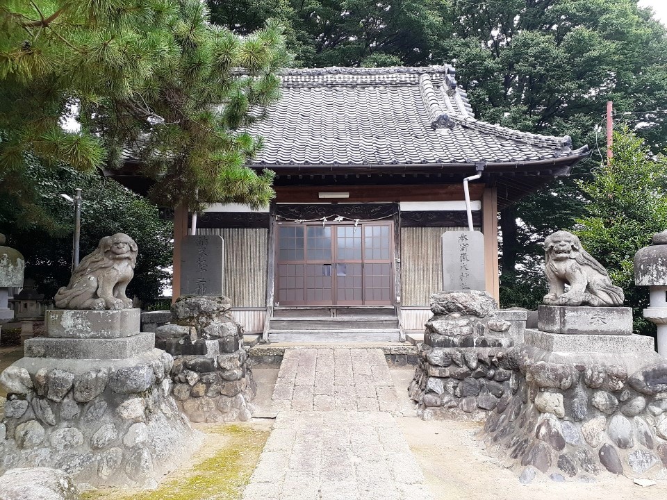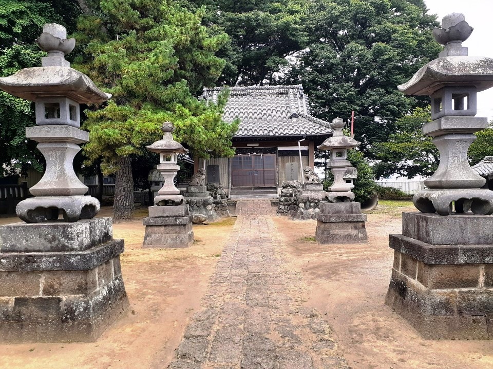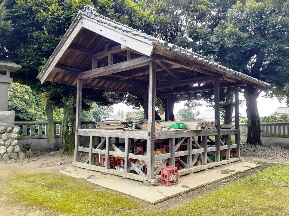 神門があり、拝殿や本殿は瑞垣でしっかりと囲まれている。この社の境内自体が自然堤防の縁みたなところで周囲の田んぼより高くなっているが、社殿は更に石垣でかさ上げされた基礎の上に鎮座している。宝暦年間(1751~64)の利根川の洪水に対する教訓からくる備えなのだろう。