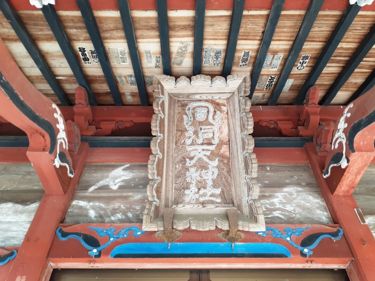 拝殿上部に掲げてある「風洞天神社」の扁額 向拝部位にも凝った彫刻が施されている。