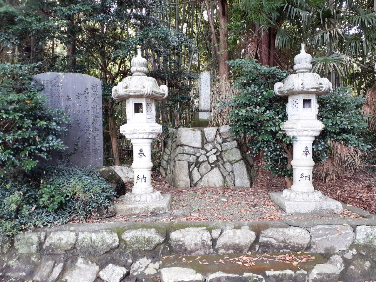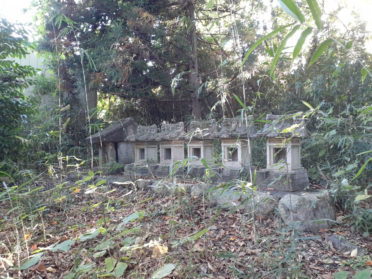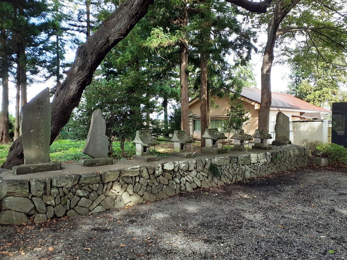 境内の西側に隣接している社務所 社務所の並びには石碑や石祠群が並ぶ。