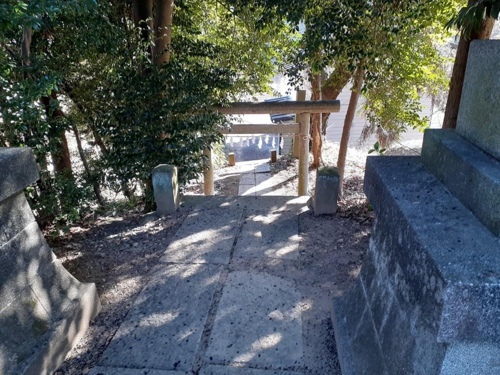 石段の中腹附近に建つ鳥居 石段を登り終えたその先に見える社殿