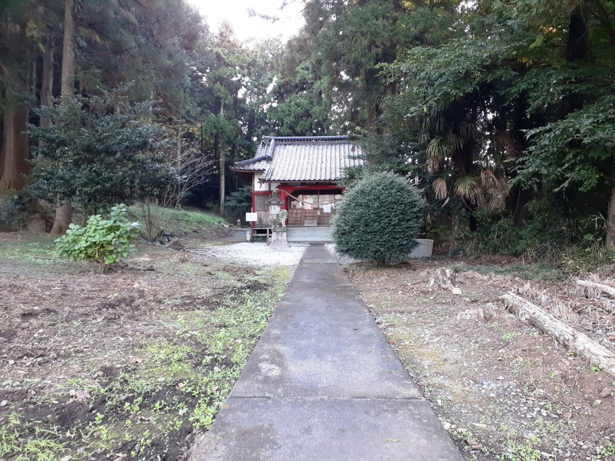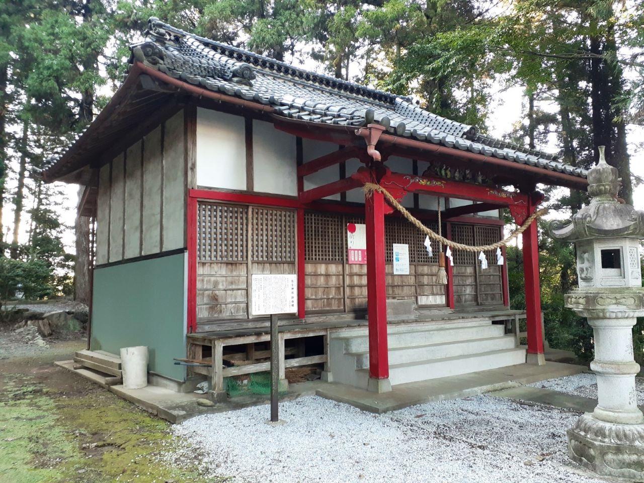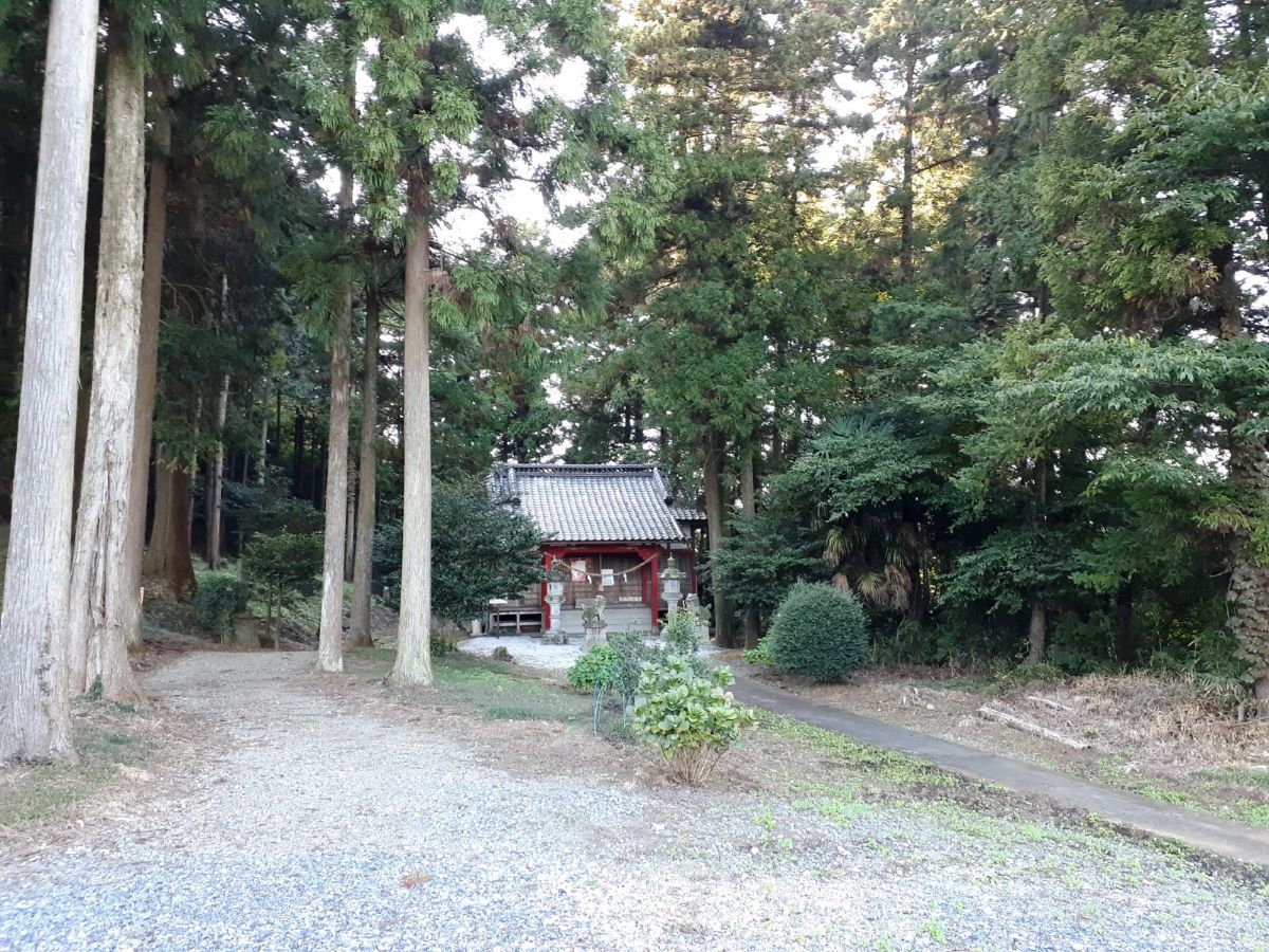 暫くはこの道を西行すること約1.2㎞、小山川支流秋山川の端を越えたところから細いY字路を左折し、更に南下。600m程進むと右側に秋山新蔵人神社の社叢と、白い鳥居が見えてくる。近郊には児玉カントリー倶楽部があり、そこを目指して行けば分かりやすい。
