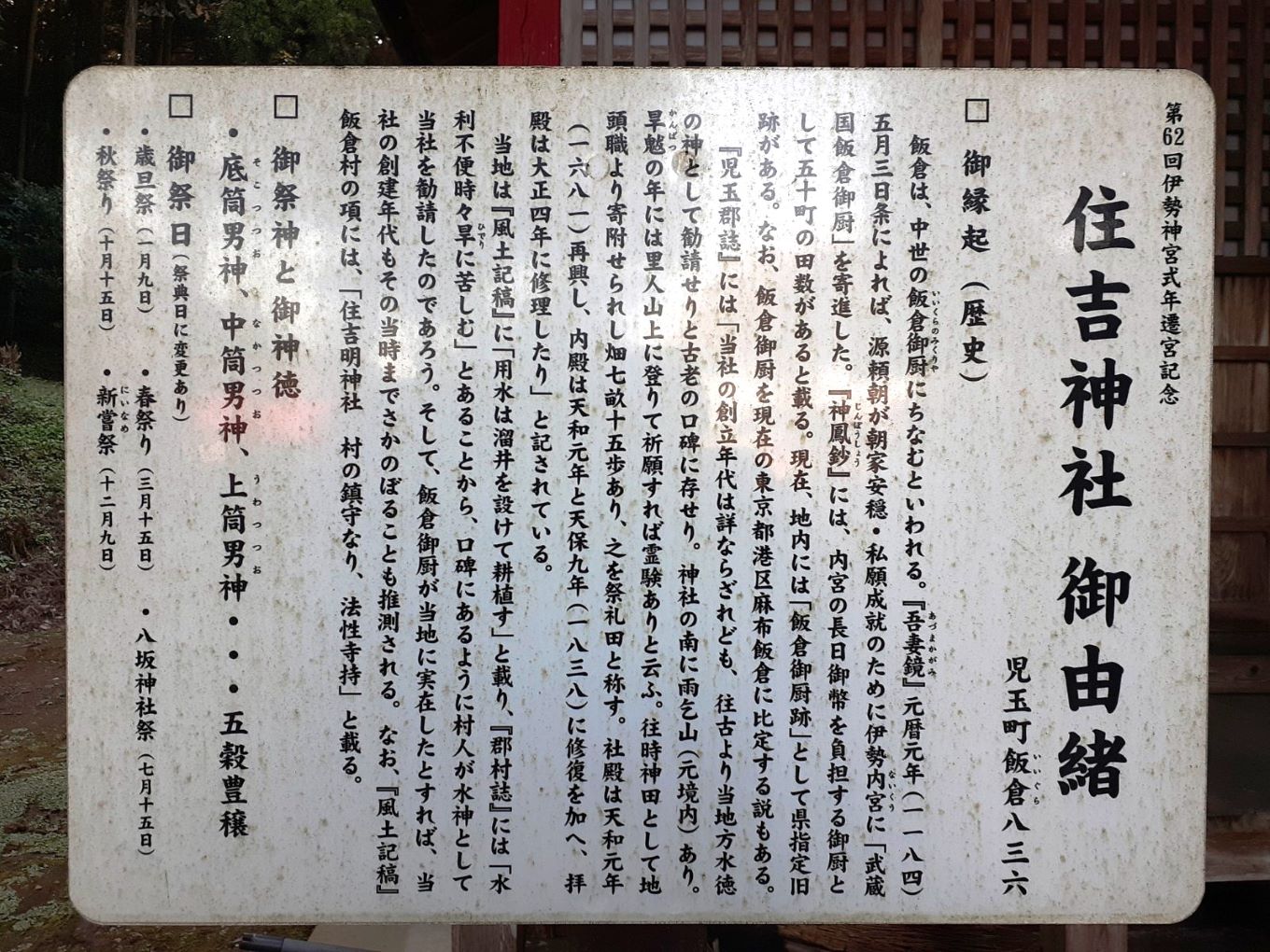 鎮座地の秋山は、小山川(身馴川)南岸に位置する農業地域であり『太平記』などにその名を残す秋山新蔵人光政ゆかりの地である。『西武南朝功臣事蹟』によれば、この秋山新蔵人光政は、南北朝期に桃井直常の部下として各地で転戦し、驍勇無双の猛者として知られていたが、正平六年(一三五一)九月に同僚の多賀某と私闘し、敗死したという。