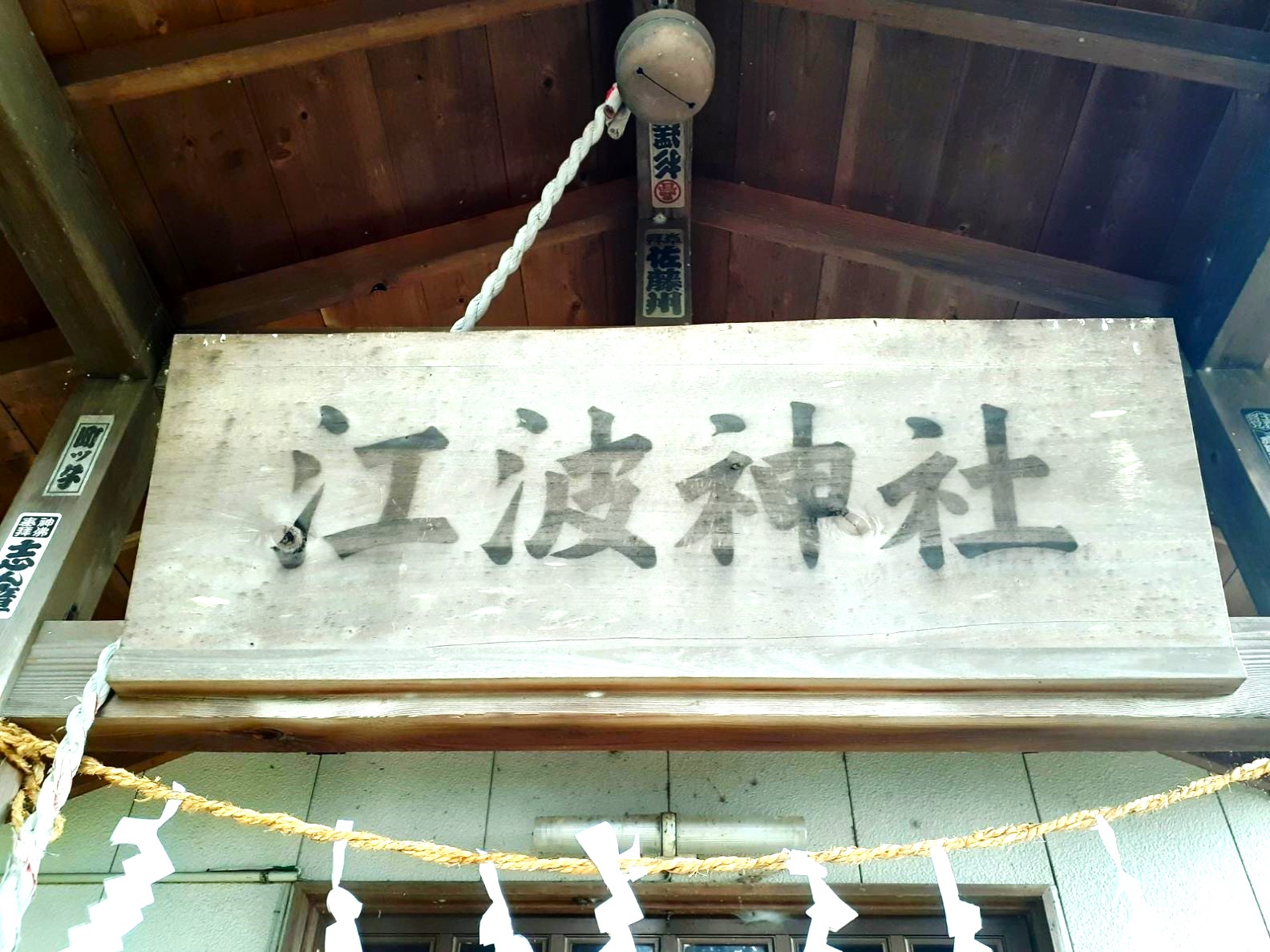拝殿に掲げてある趣のある扁額 社殿左側にポツンとある石祠。詳細不明。