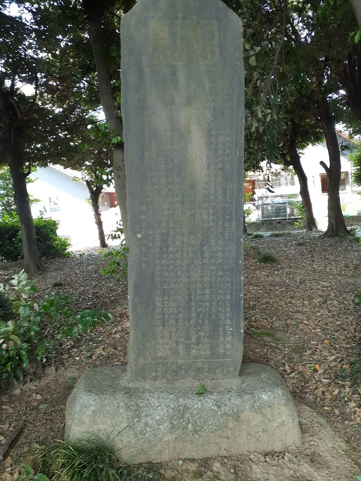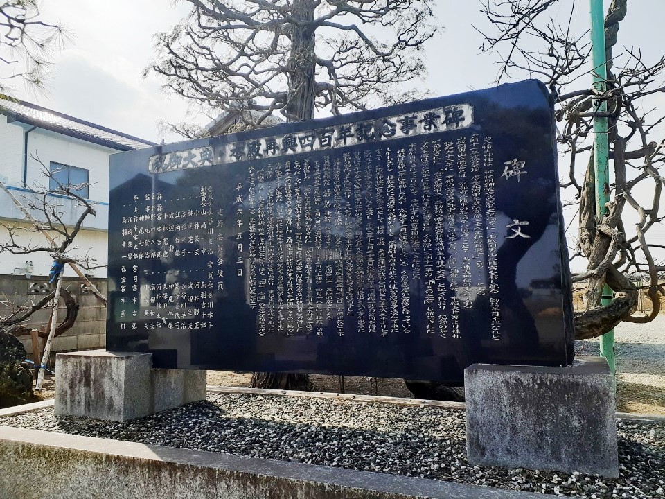 以上概要を記し、先人達が精神の拠り所として此のお宮を守り伝え「敬神 崇祖」の立派な精神文化を残して下さった事に感謝しつつ、更に後世の人々に受け継いて戴く為に此処に是を建立す(以下略)