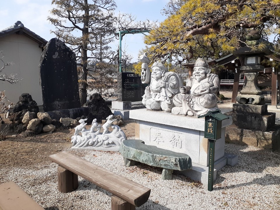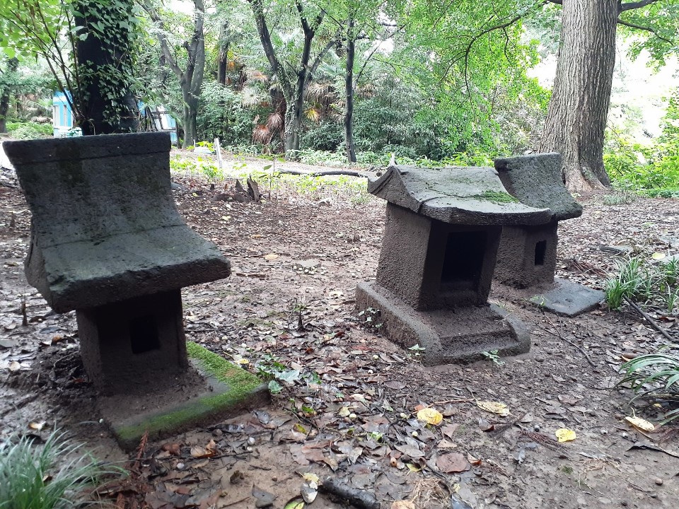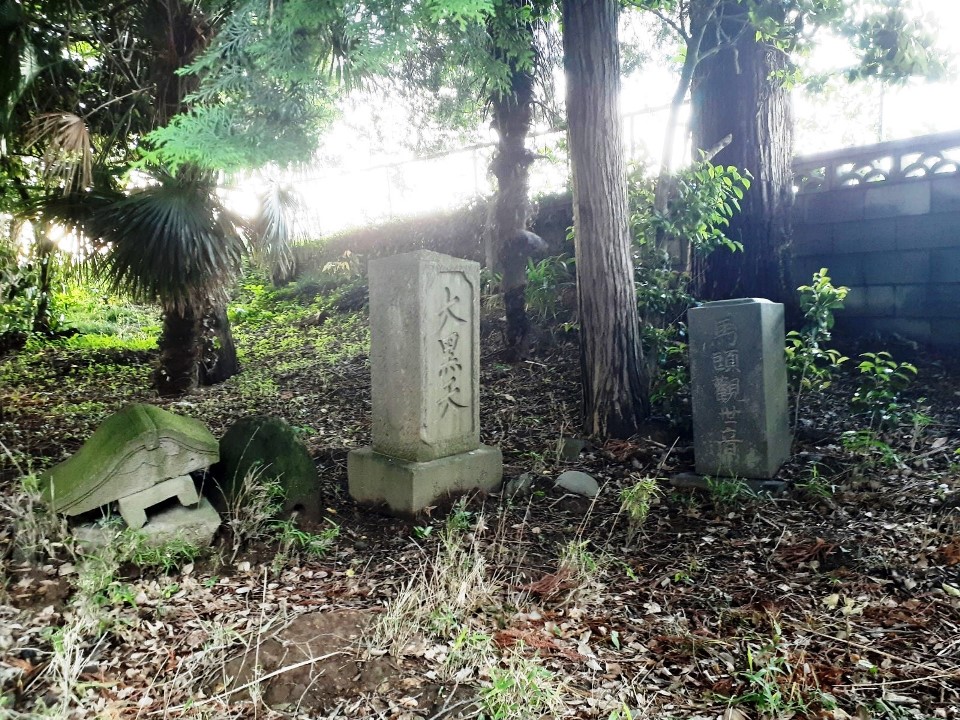 本殿左側奥にある大黒天・馬頭観音の石碑。    本殿右側奥に鎮座する境内社か。
