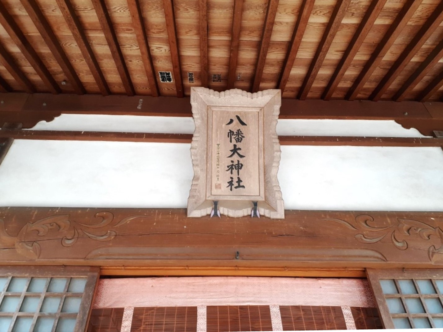 拝殿は寛保二年に再興したるが、寛政辰年七月に改築をしている。その後幾度が営業を行っている。しかしながら、拝殿並びに天満宮の老朽が激しく、使用耐え難き状態なれば忘急処置で凌んで来た。そこで八幡大神社四百年記念事業として、拝殿・幣殿・天満宮外宇の改築を目標として、平成三年より七年迄の五ヶ年計画で募金を行いたく立案し、平成二年十二月二十三日の総会の席上で満場一致の賛同を得た。計画に着手するや氏子崇敬者の敬神の念篤く、目標を越える多額の奉納計画書の提出を載く事が出来た。昭和の御代も平成に変わり、これを祝し御大典記念事業としての意味を含めて事業に着手した。(中略)