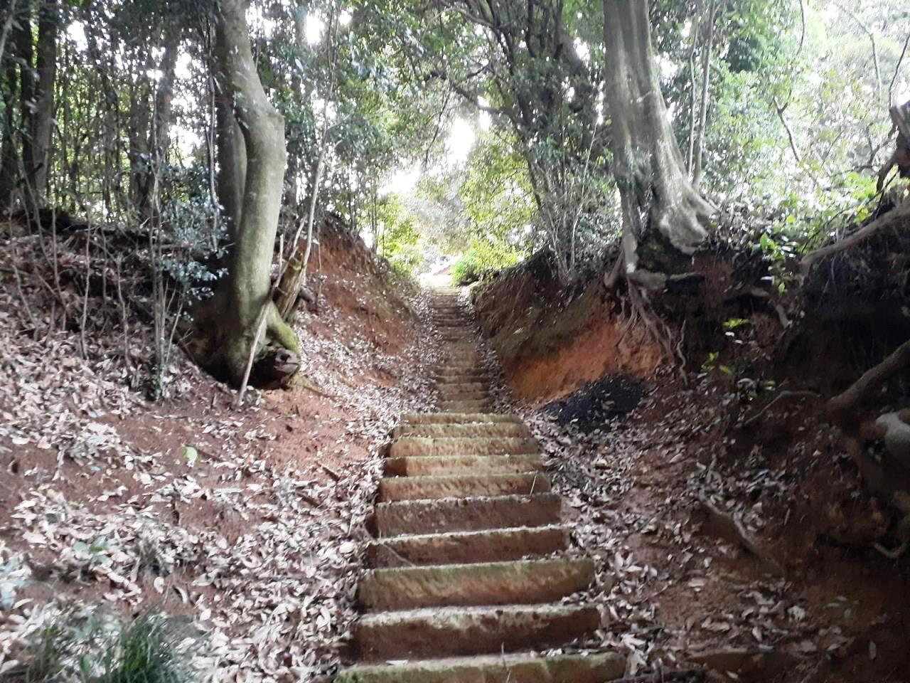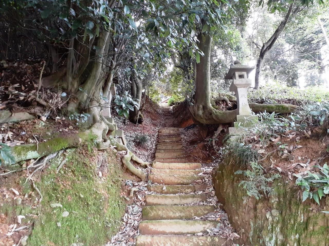 丘陵地に鎮座していて、石段を登る。途中、灯篭があり、テラス上に平らに馴らしている場所もある(写真左)。その後石段を登るわけだが、両側の路面を掘り込んだ断面も見ることができ、少しワイルドな気分となった。