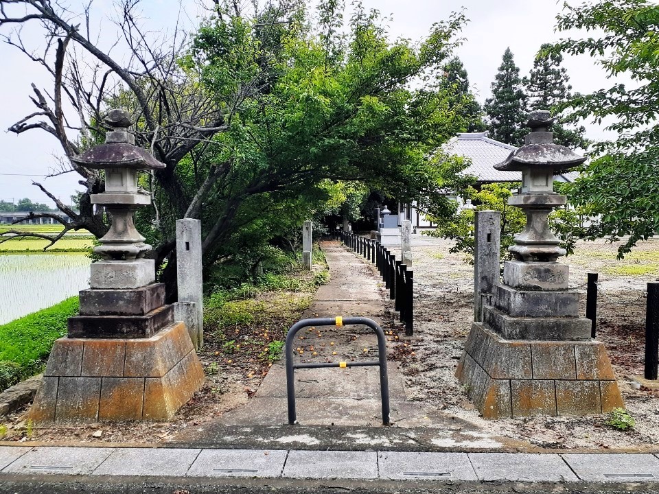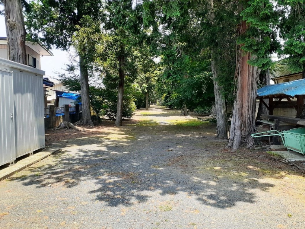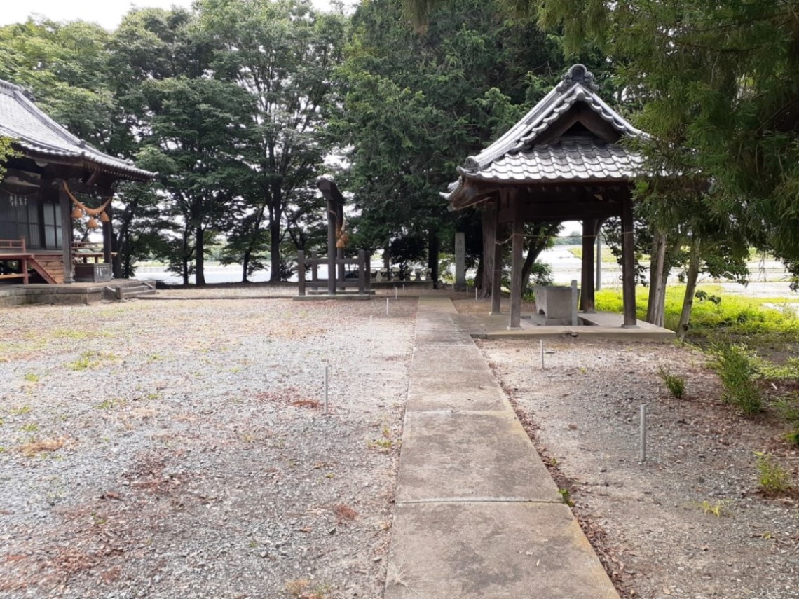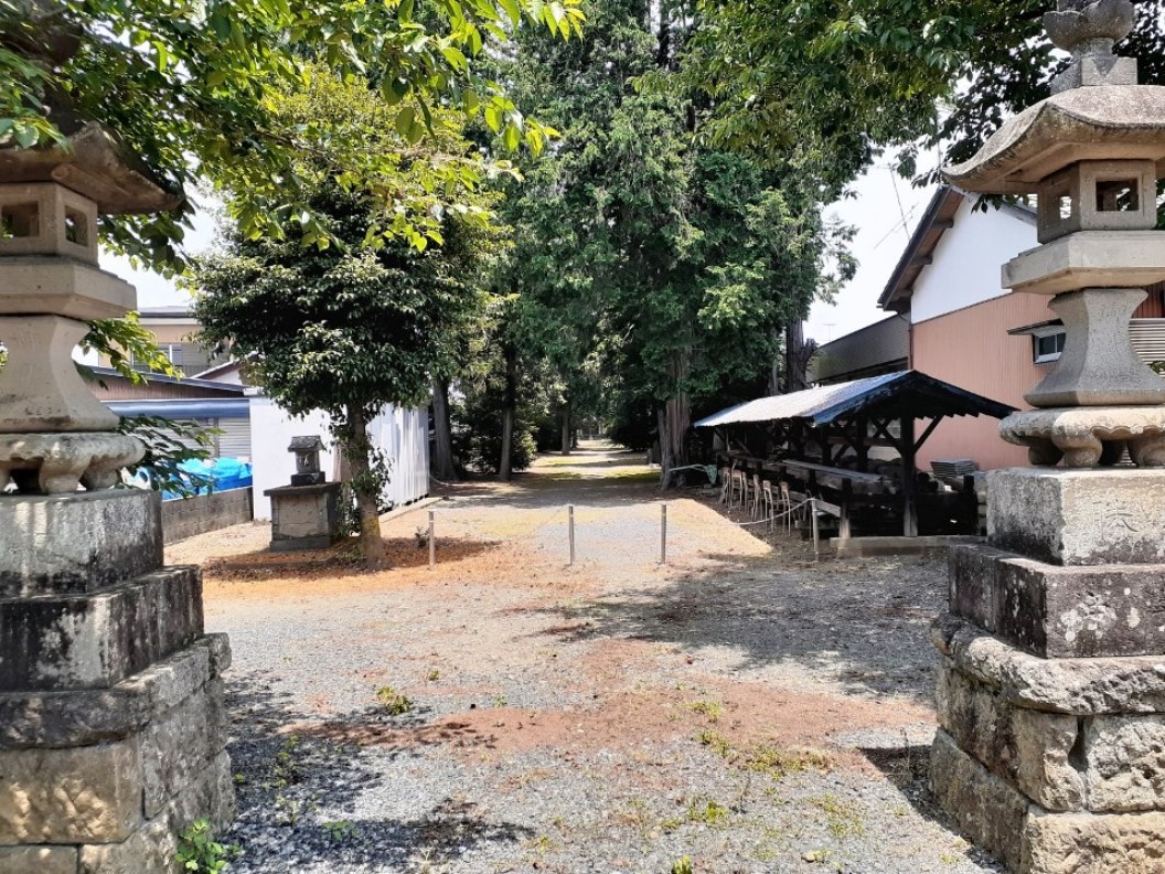 社号標柱は北側の道路沿いにあるが、そこから社殿方向に参道を進むには一旦南方向に進み、突き当たりを左に折れ、そこからまた直進し、鳥居がある所まで進み、北側に鎮座する社殿を目指す、丁度「コの字」のような形となっている。