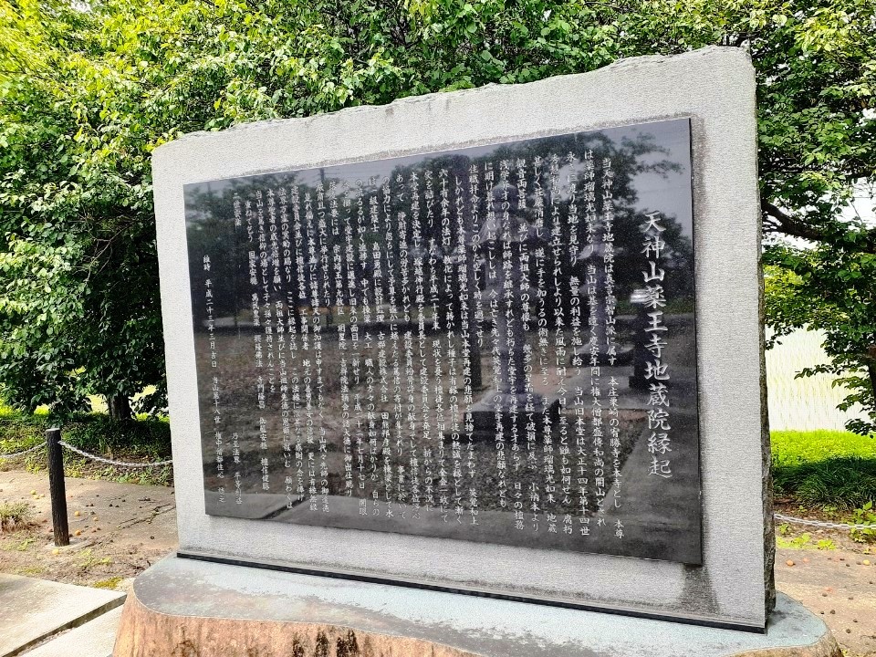当天神山薬王寺地蔵院は真言宗智山派に属す 本庄栗崎の宥勝寺を本寺とし 本尊は薬師瑠璃光如来なり 当山は基を遠く慶安年間に権大僧都盛傳和尚の開山とされ 永きに渡り当地を見守り 無量の利益を施し給う 当山旧本堂は大正十四年第十四世秀慧和尚により建立せられしより以来た風雨に耐え今日に至ると雖も如何せん 腐朽甚しく荘厳消磨し 遂に手を加うるの術無きに至る また本尊薬師瑠璃光如来 地蔵観音両菩薩 並びに両祖大師の尊像も 幾多の星霜を経て破損に及ぶ 小衲本より浅学菲才の身なれば師跡を継承すれども朽ちた堂宇を再建する才あらず 日々の檀務に明け暮れ想い起こししは 今は亡き先々代英覚和上の堂宇再建の悲願なれども 住職拝命よりこのかた空しく時を過ごせり(中略)地元の善男善女の信援 更には有縁無縁法界万霊の冥助の賜なり ここに縁起を誌し この法縁に深甚なる感謝の念を捧げ 本尊聖者の威光倍増を願い 両祖大師並びに当山祖師先徳の恩顧に報いむ 願わくは当山を篤き信仰の場として子々孫々護持されんことを 重ねて乞う 国家安穩 萬民豊楽 興隆佛法 寺門隆昌 伽藍安穏 檀信健勝 二世安楽 乃至法界 平等利益(以下略)