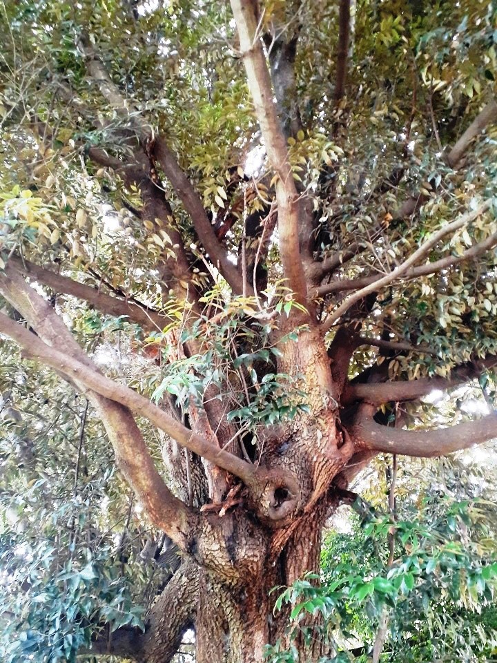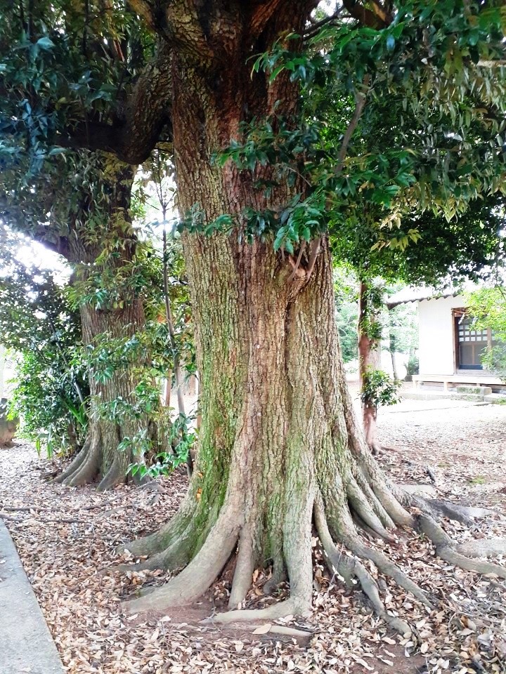 参道の途中に聳え立つ巨木(写真左・右)。紙垂等はないし、ご神木ではないようだが、参道両側にある樹木の中でも幹は太く、雄々しいその姿に感動し、思わず写真を撮ってしまった。