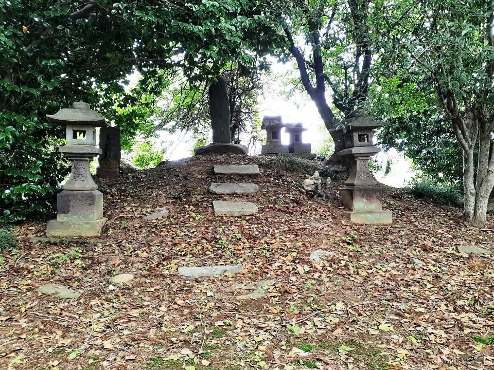 塚の頂には仙元大日神があり、左側には青面金剛の石碑、右側には詳細不明な2基の石祠が両脇を固める。