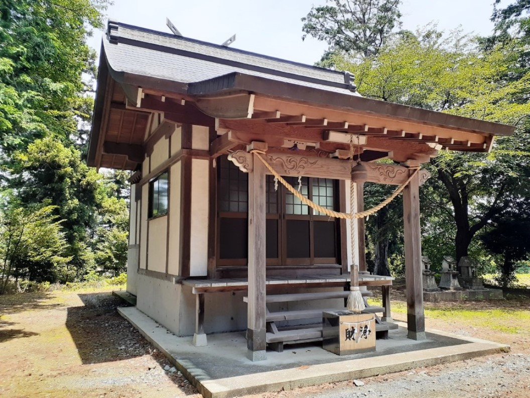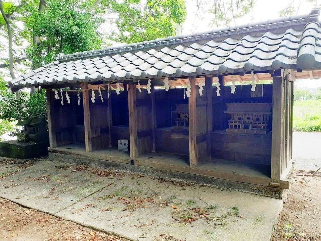 拝殿の右側後ろにある境内社、合祀社。合祀社(写真左)には名札が付いていて、左から八王子神社、熊野神社、稲荷神社、明見山・琴平神社、天満宮が祀られている。また合祀社の右側には、天手長男神社、蚕影山神社が祀られている。
