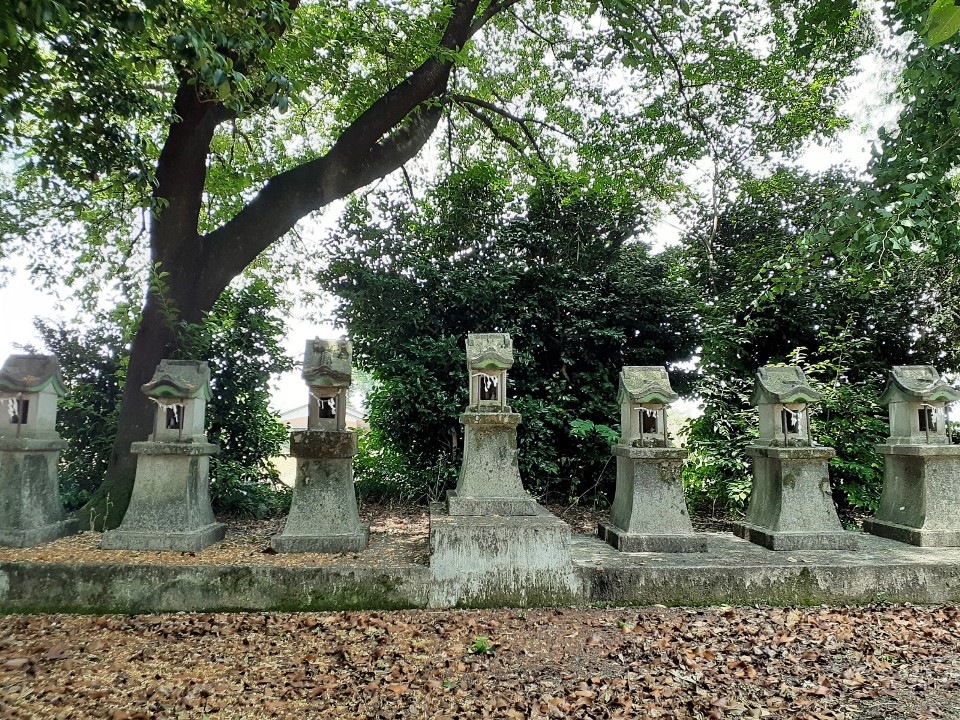 左に曲がった参道を進むと、               鳥居右側には六基の石祠が鎮座。