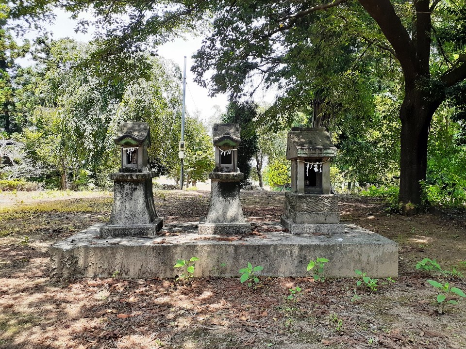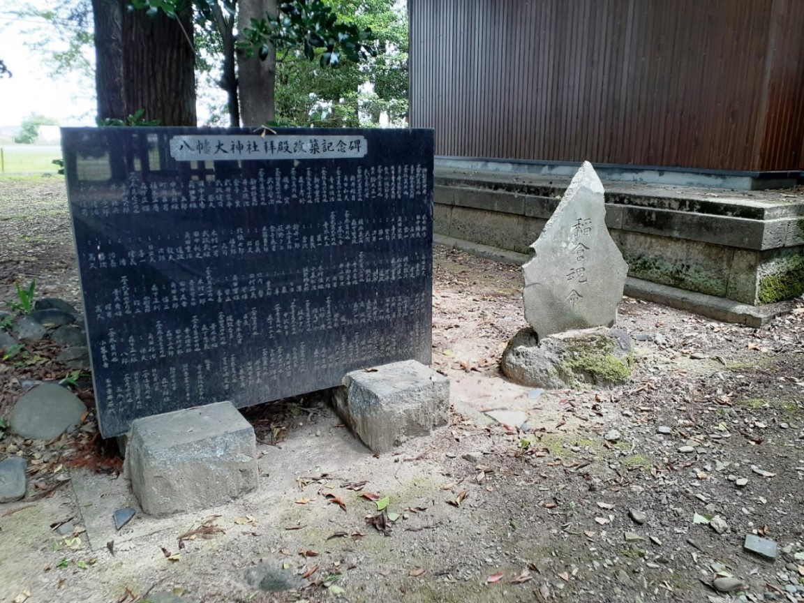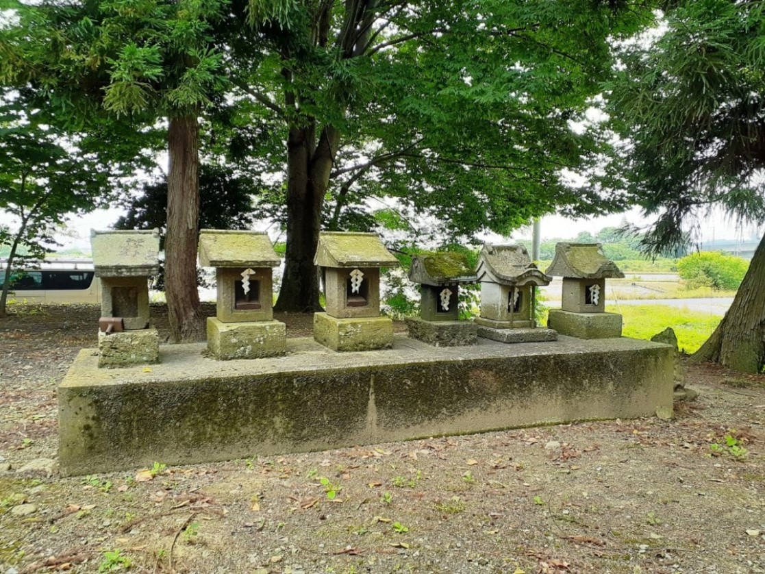 社殿右奥には合祀社が鎮座(写真左)し、左から諏訪大神・稲荷大神・大荒神・八坂大神・天手長男命・八幡大神が祀られている。また合祀社の手前には、石碑(同右)があり、宇賀神・大国主神が祀られている。