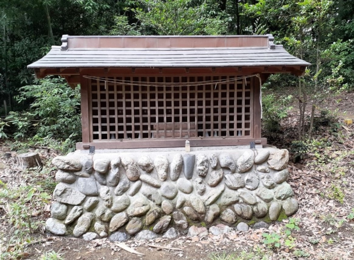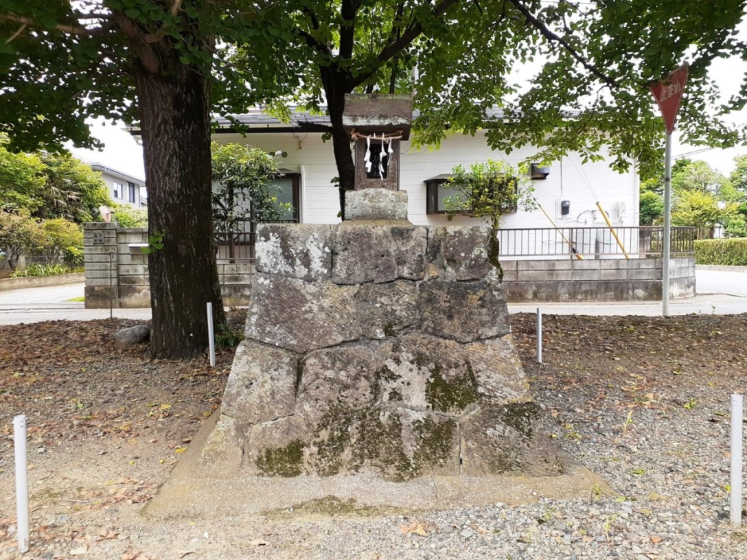 社日神の基礎部分はコンクリート製であるが、この基礎部分はかなり高さがあり、また入り口にあった灯篭2基の基礎部分もかなりの高さであった。思うに山崎天神社の鎮座場所は、志戸川とその支流である藤治川の合流地点から南側で、それ程遠くない場所であるため、河川氾濫対策として、このように基礎部分を補強し、ある程度の高さに積み上げているのではないだろうか。あくまで筆者の勝手な推測ではあるが。