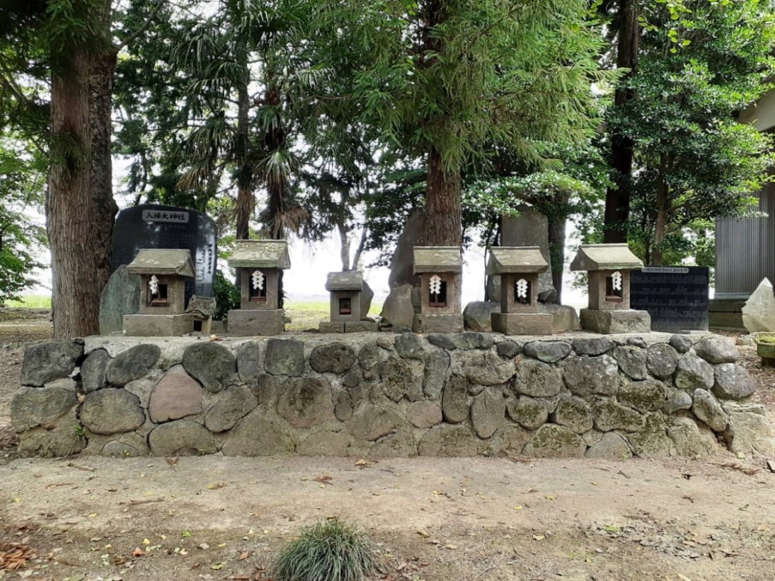 一番左側の「南閣神社」とは何神社なのか不明。その隣は「稲」しか判明できなかったが、恐らくこれは「稲荷神社」であろう。右奥にある「蚕影神社」以外の4基の石祠は詳細不明。