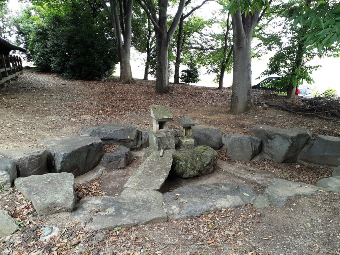 社殿の右側にある石で囲まれた空池の中に鎮座する石祠(写真左)。石の切り口等からそれ程昔からあるものではない雰囲気を感じる。石祠も恐らく弁財天あたりと推測。空池も時期的に水がないのかも不明。また社殿左側には六基の石祠があるが(同右)、こちらもどの神様が祀られているのかが、どの文献・HPみても判明しなかった。