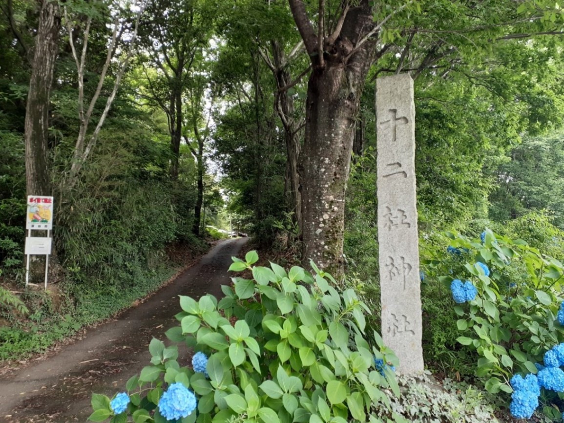 旧花園町・武蔵野地区に鎮座する武蔵野十二社神社は途中までの進行ルートは桜沢八幡大神社を参照。八幡大神社から国道254号線を美里町方向に1.3㎞程北上し、「鐘撞堂山 ふるさとの森」の看板がある信号のある交差点の手前のT字路を左折する。道幅の狭い道路になる為、対向車量には注意しながら進むと、正面に小高い森が広がり、武蔵野十二社神社の社号標柱も見えてくる。