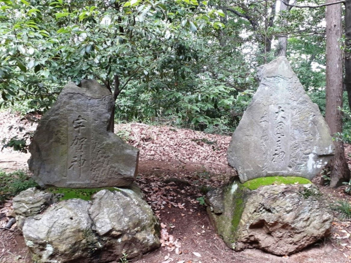 六基の石祠の奥には様々な石碑・石祠がある。おそらく一カ所に纏めたものであろう。仙元大日神、その周辺に小御嶽石尊大権現と食行身禄霊神等の石碑(写真左)があり、「登山記念碑」「八幡大神社拝殿改修記念碑」を挟んで、右側に倉稲魂命の石碑(同右)がある。
