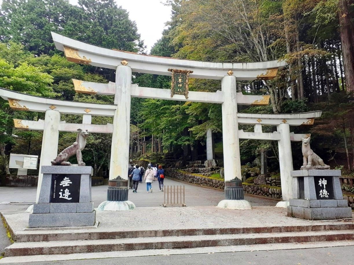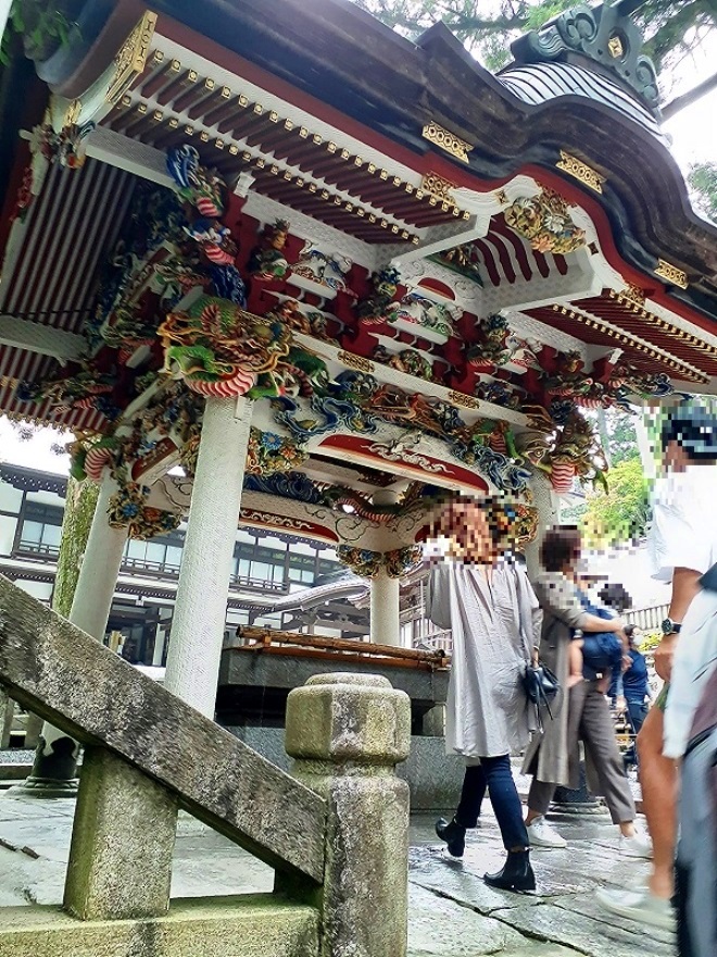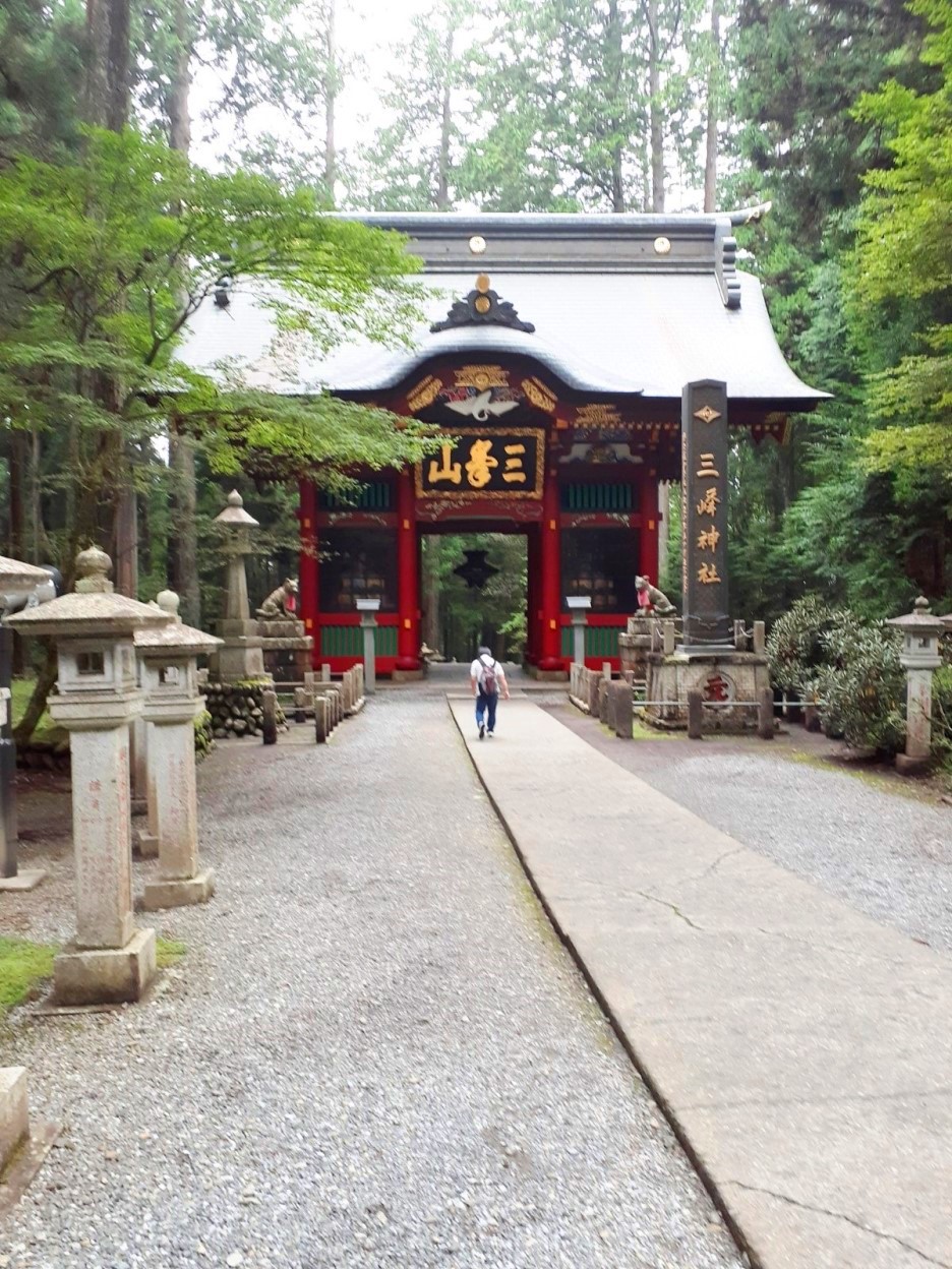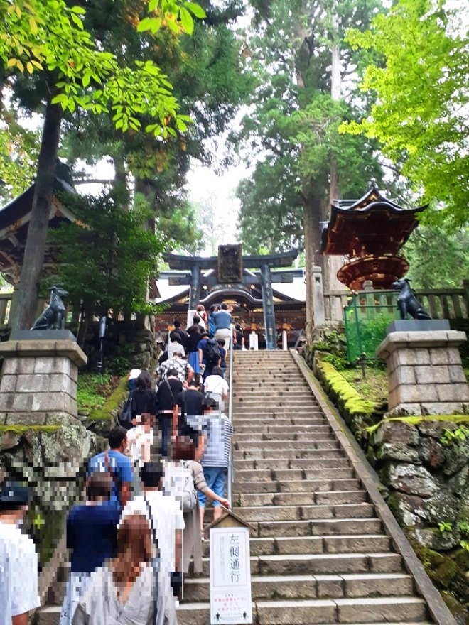 三ツ鳥居を過ぎてから200m位進んでT字路を左に曲がると、1691年に建立された隋身門がある。専用駐車場から三ツ鳥居までのルートは、看板や食事処等もあり、観光地らしさが漂うが、鳥居を過ぎると、巨木・老木等の樹木や石灯篭が参道の両側に立ち並び雰囲気は一変する。当日は平日で、小雨交じりの曇りの天候乍ら、多くの参拝客がいたが、まず神秘的で厳かな雰囲気に圧倒されたように、私語は全くといってなく、身が引き締まる思いを多くの参拝客も強く感じたのではないだろうか。とにかく空気感が全く違う。時折、周囲が霧で覆われるような場面もあったが、それが逆に神秘性を増幅させてしまったようだ。