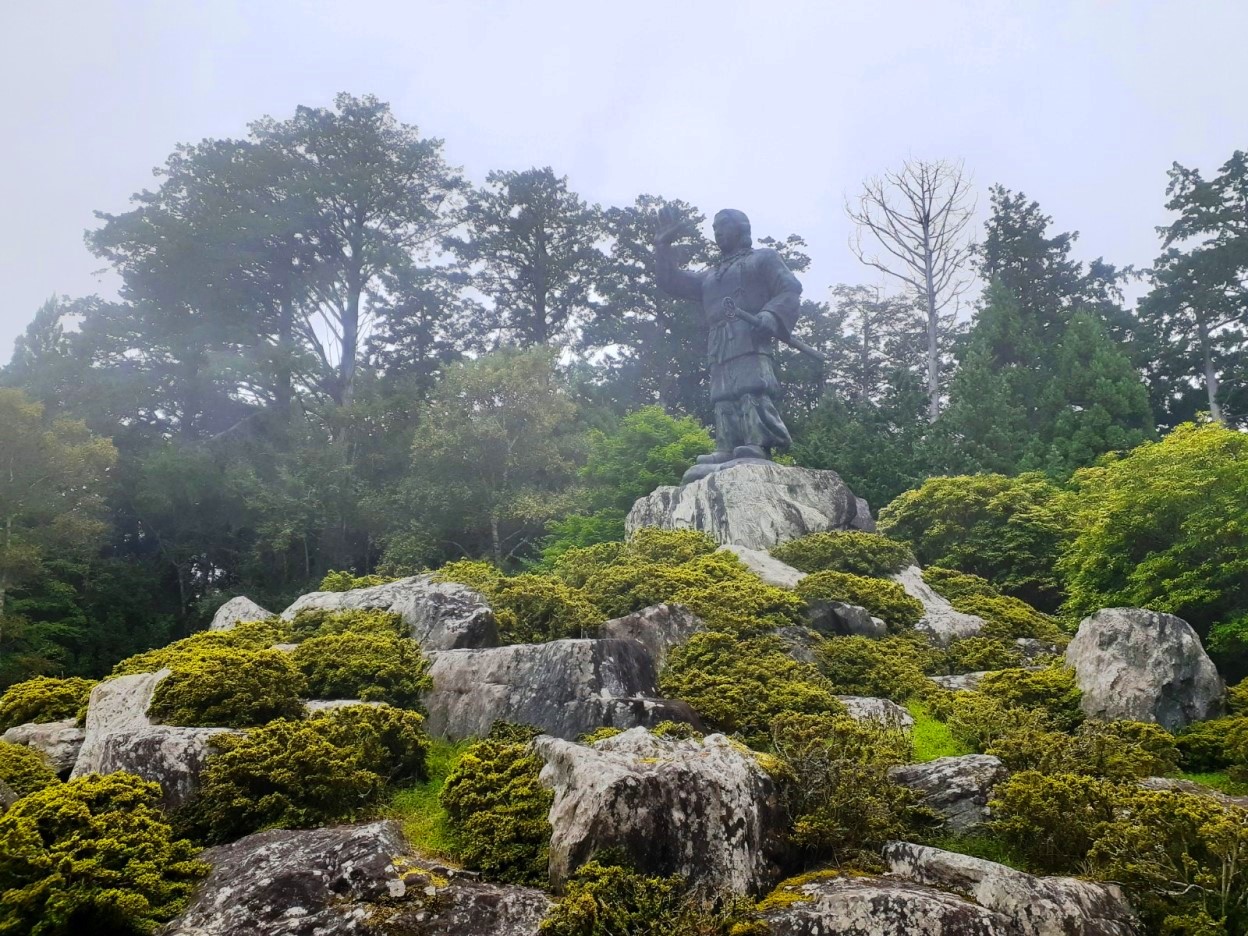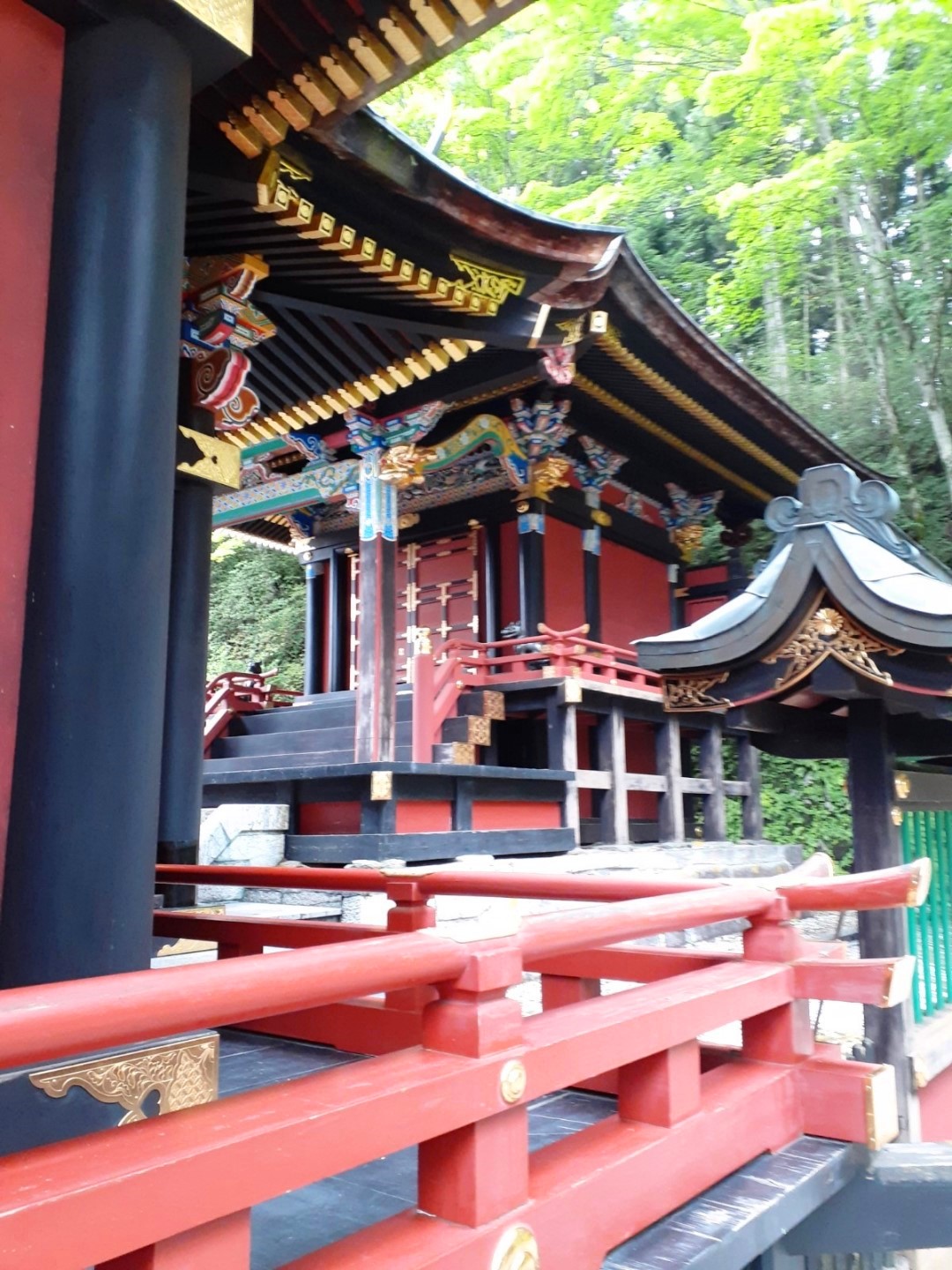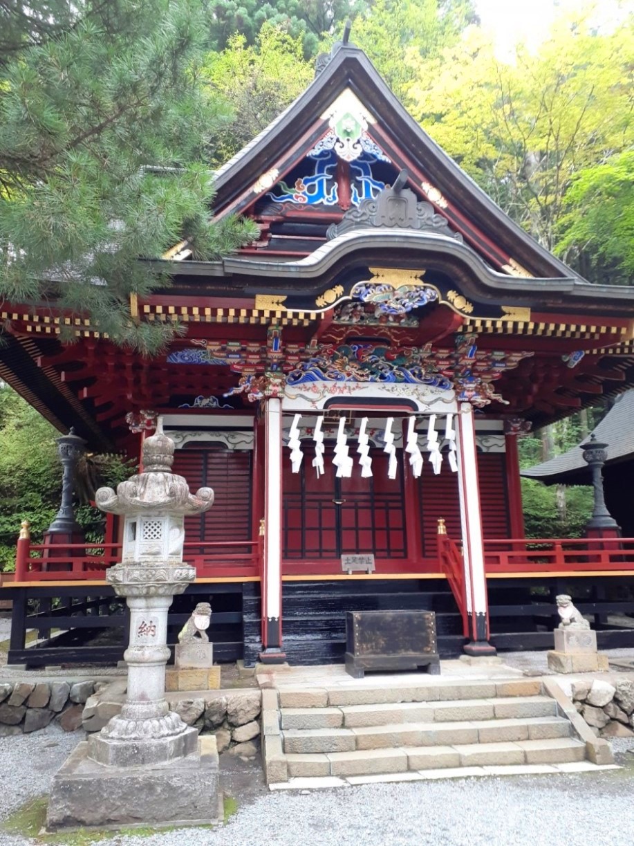 三ツ鳥居を過ぎてから200m位進んでT字路を左に曲がると、1691年に建立された隋身門がある。専用駐車場から三ツ鳥居までのルートは、看板や食事処等もあり、観光地らしさが漂うが、鳥居を過ぎると、巨木・老木等の樹木や石灯篭が参道の両側に立ち並び雰囲気は一変する。当日は平日で、小雨交じりの曇りの天候乍ら、多くの参拝客がいたが、まず神秘的で厳かな雰囲気に圧倒されたように、私語は全くといってなく、身が引き締まる思いを多くの参拝客も強く感じたのではないだろうか。とにかく空気感が全く違う。時折、周囲が霧で覆われるような場面もあったが、それが逆に神秘性を増幅させてしまったようだ。