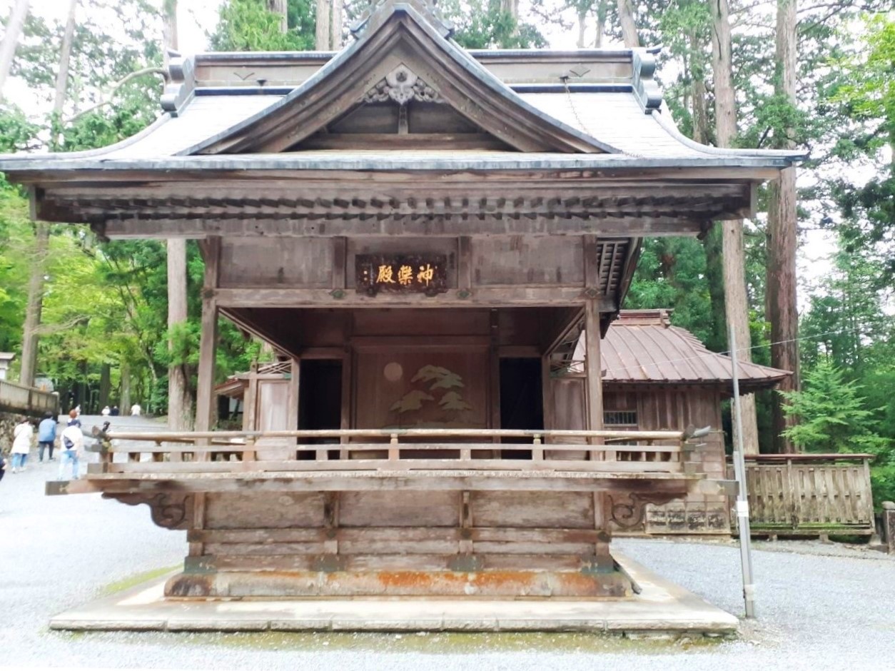 木のぬくもりを感じる神楽殿 社殿の右側には祖霊社が鎮座