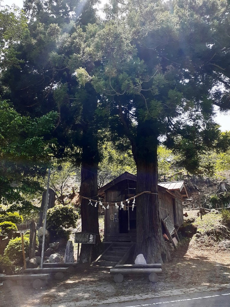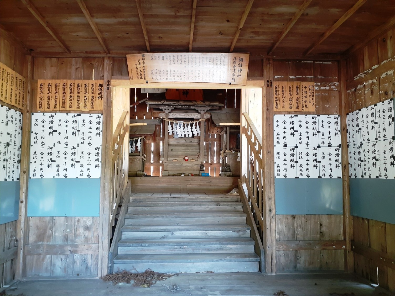 石段の先には鳥居があり(写真左・右)、その先に西古里矢弓神社社殿が見えてくる。