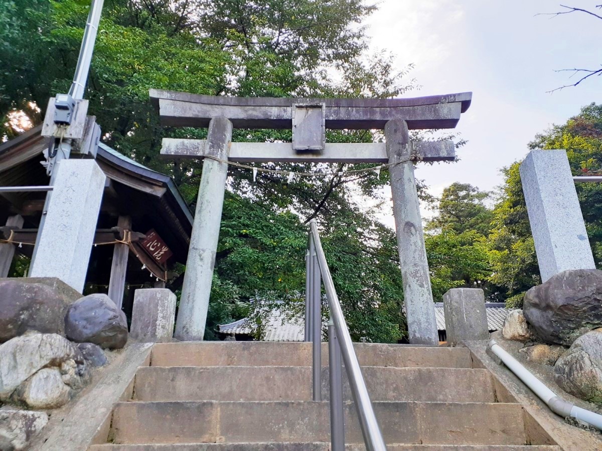 参道の先にある石段と、高台上にある鳥居。 鳥居の社号額には何故か「稲荷大明神」と表記