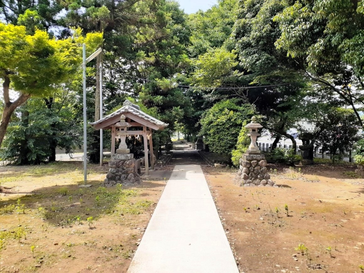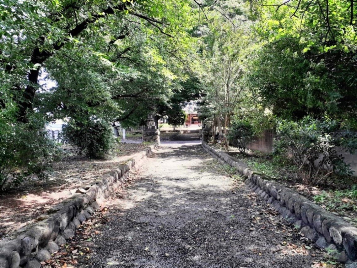 正面に伸びる参道と、その右側にある舗装されていない路面。