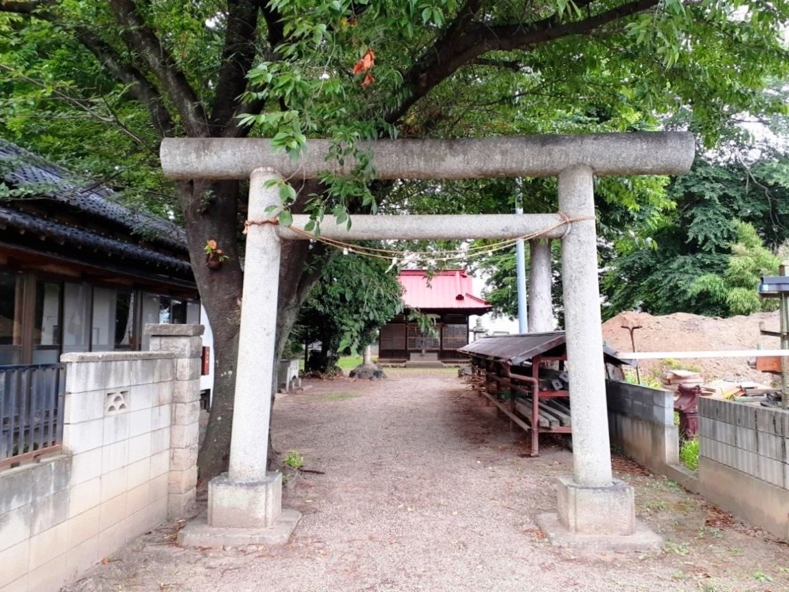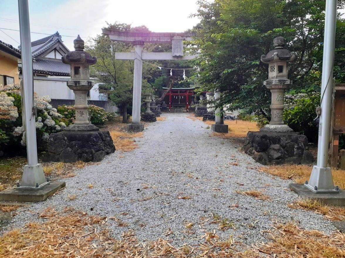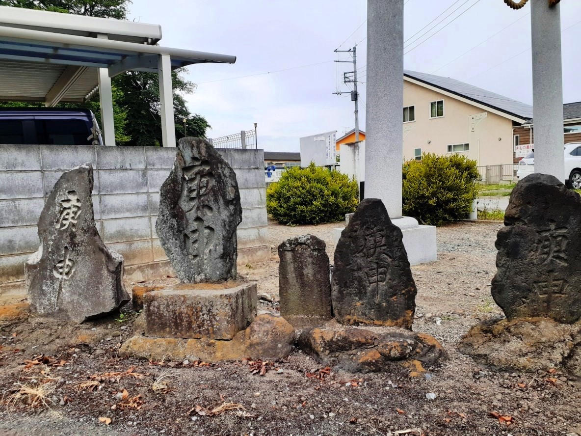 一の鳥居の左側に庚申塔等の石塔が並ぶ。 二の鳥居に続く参道