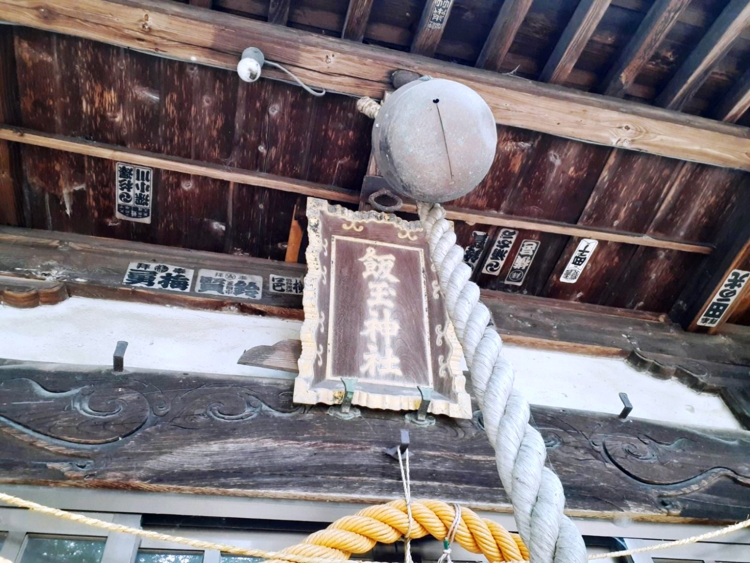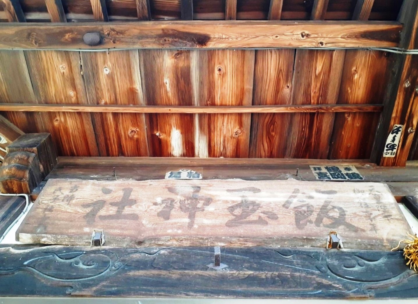 拝殿上部に掲げてある扁額 扁額の左側にある社号額