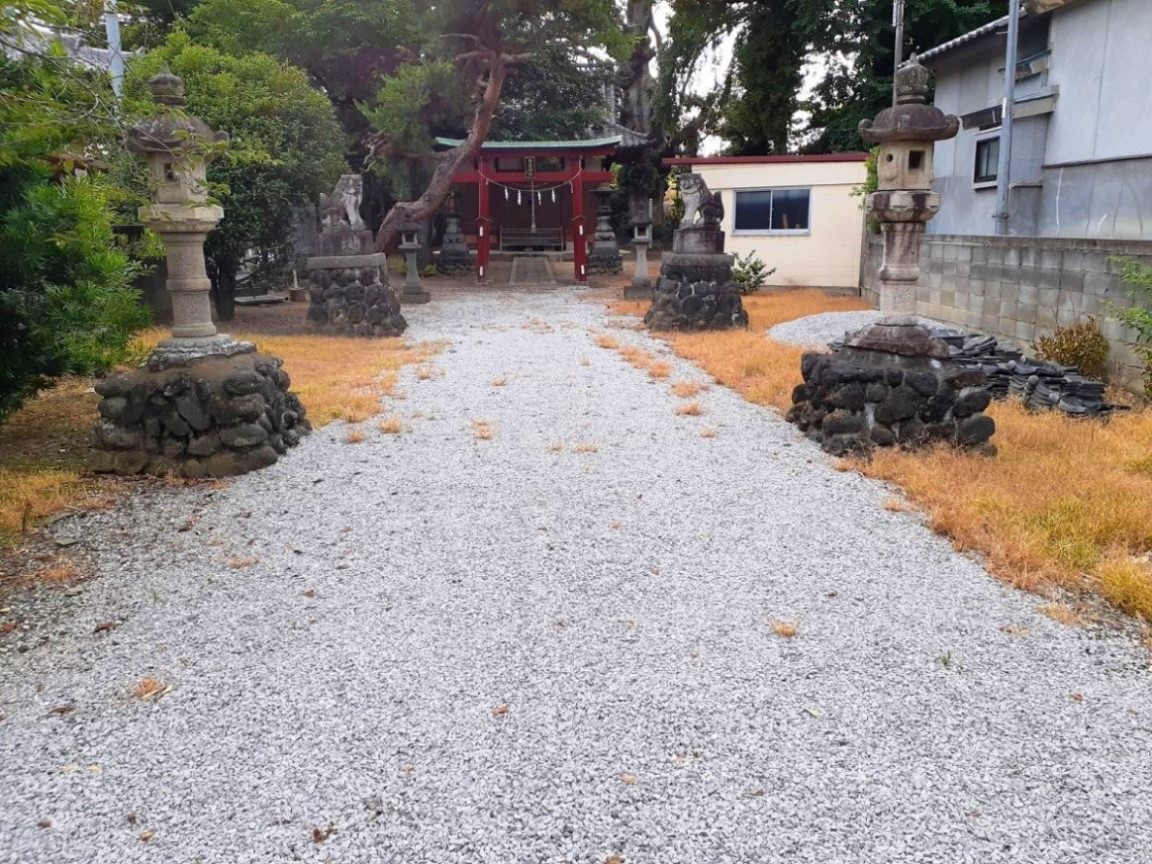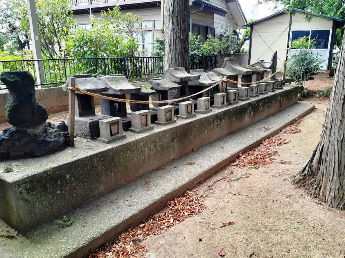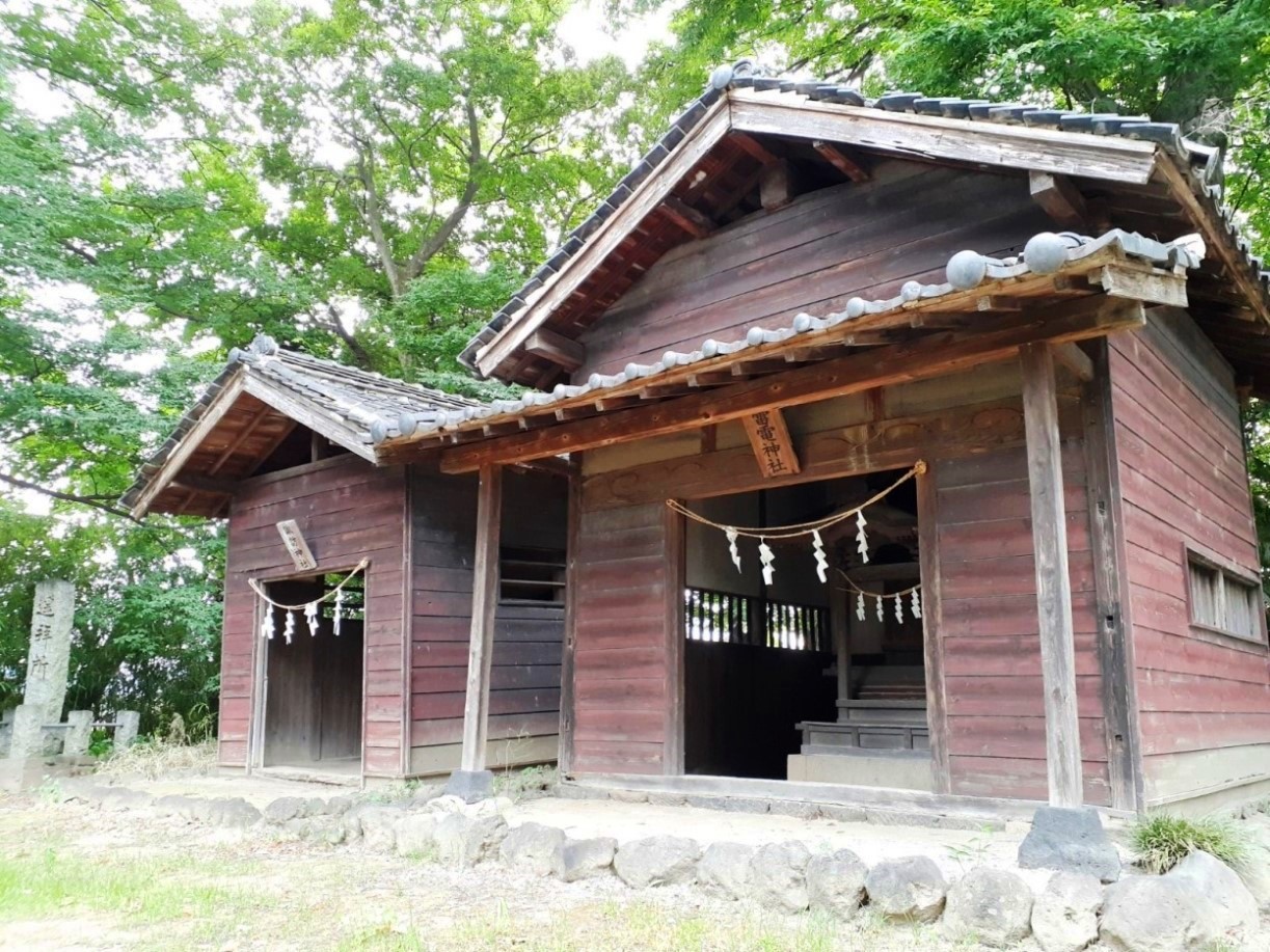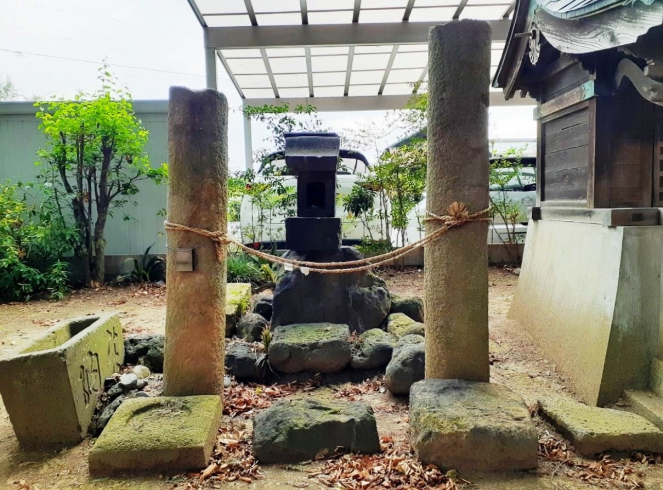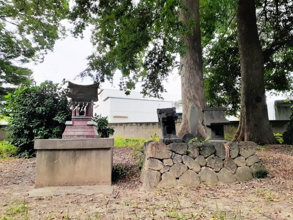 社殿左側に鎮座する境内社・諏訪、雷電社 草木に覆われているが富士塚もあり